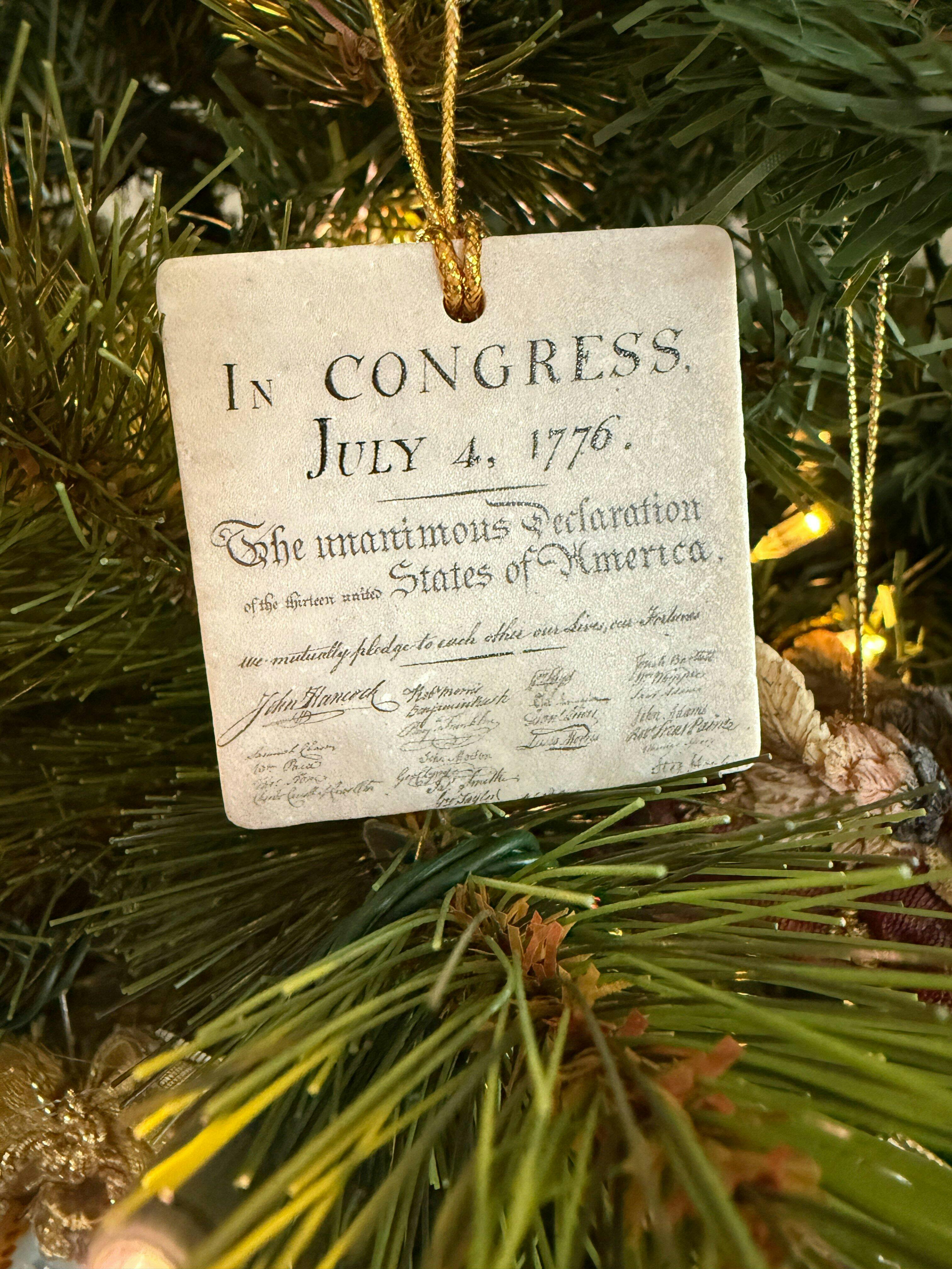 The sacred cursive script and signatures of the original Declaration of Independence are beautifully screened onto this hand-selected, one-of-a-kind marble ornament.