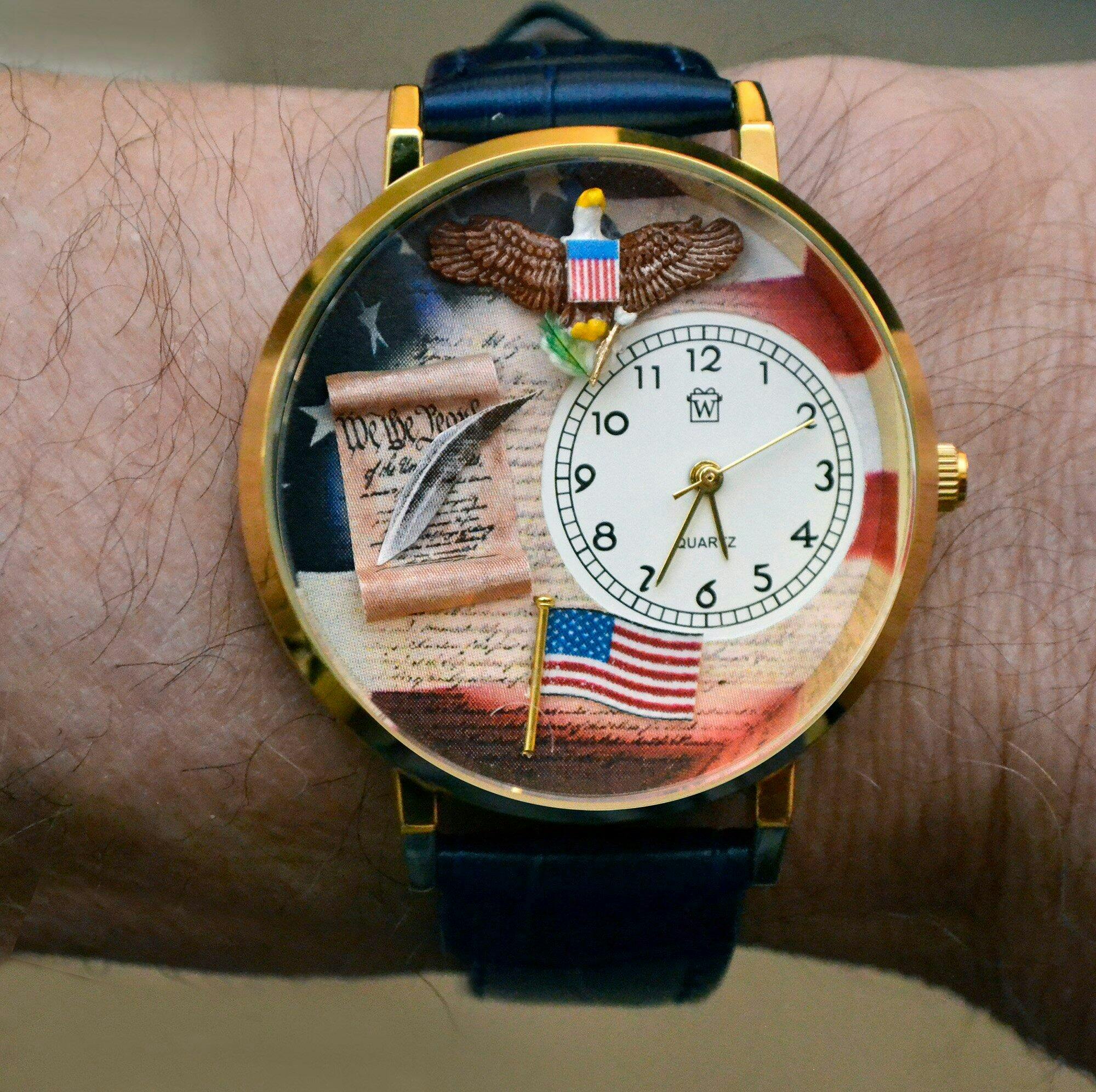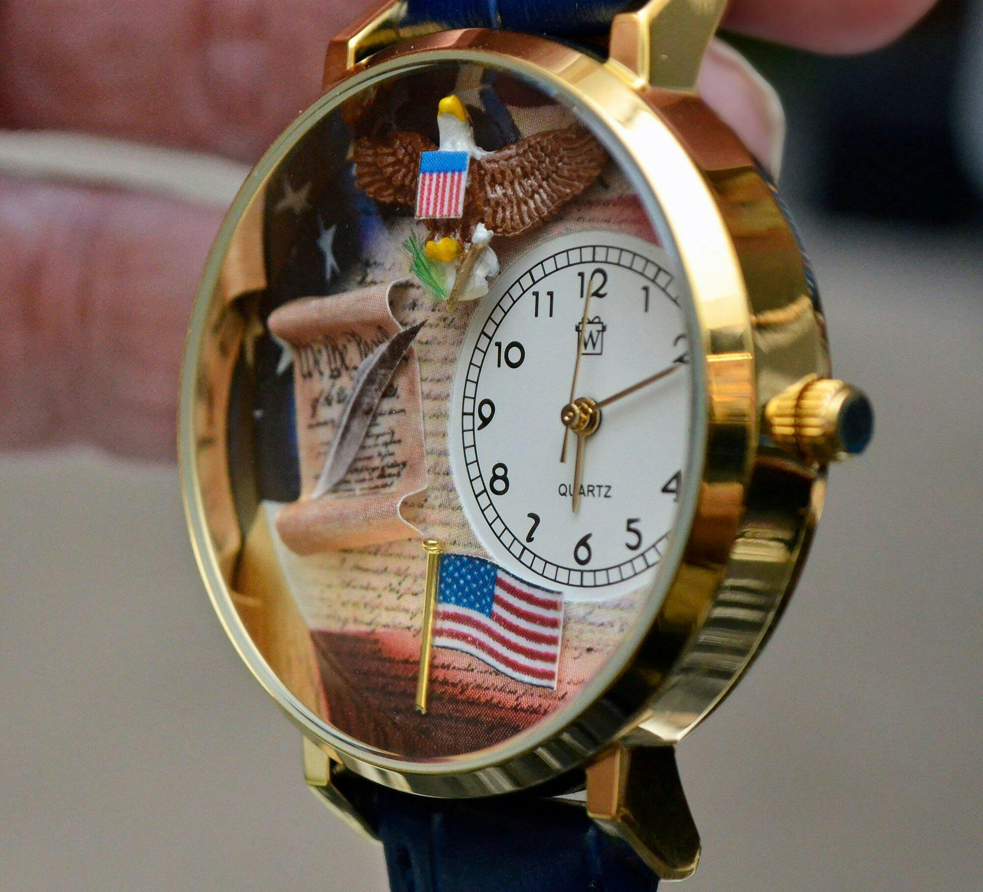 • The perfectly patriotic timepiece, this wristwatch features images of an eagle, the Constitution, and the star spangled banner - uniquely American objects that remind us of who we are. With a handsome navy wrist strap and an easy-to-read analog dial, it's a statement piece with lots of style.
