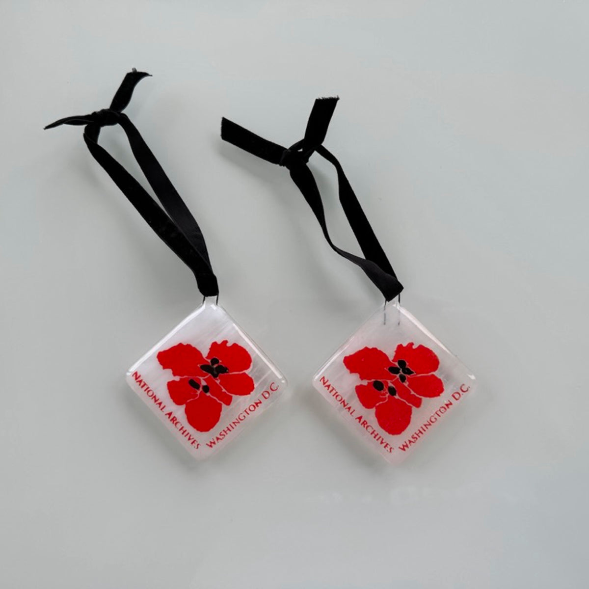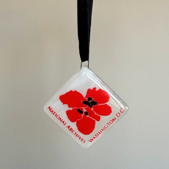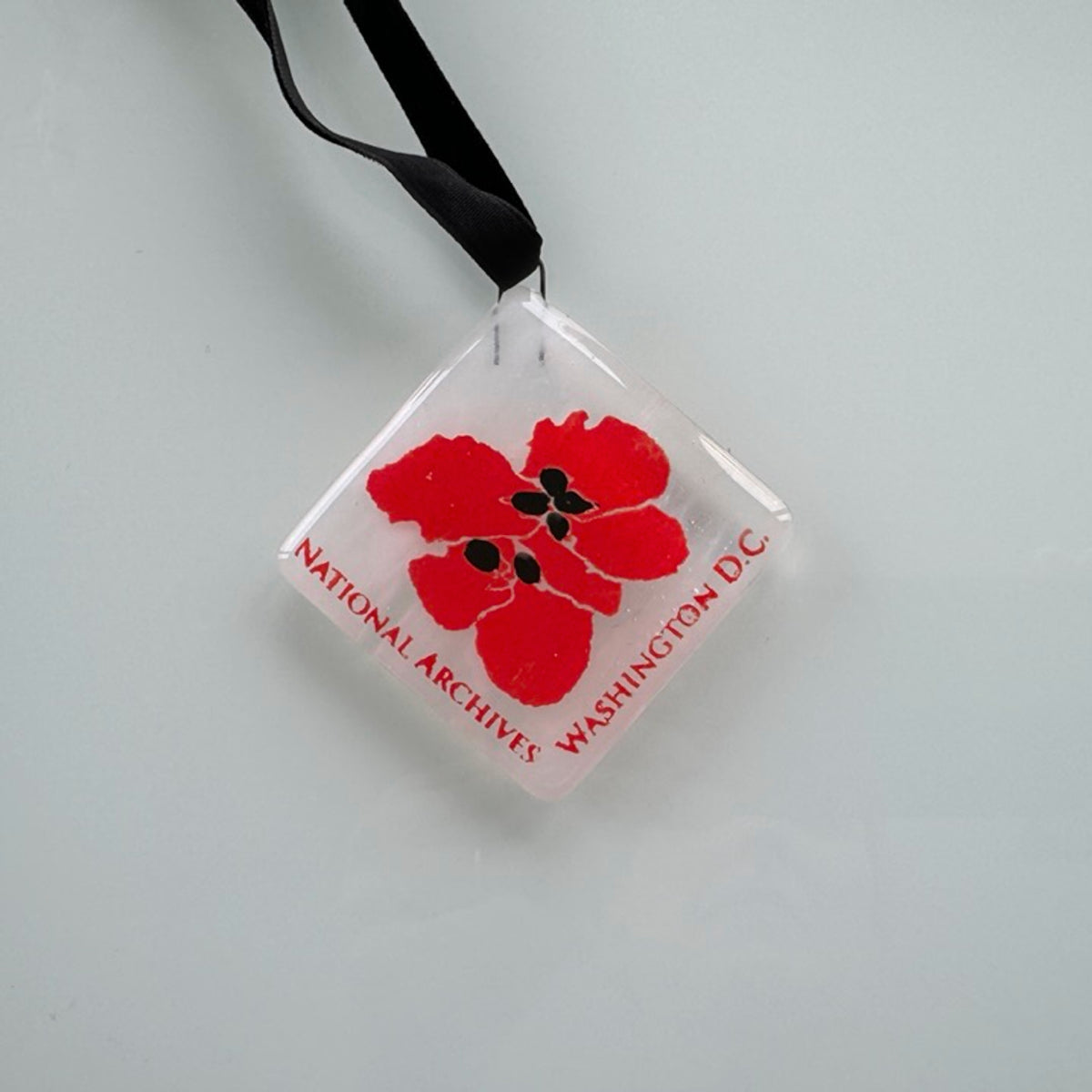 You don't have to wait for the holidays to hang our Cherry Blossom Fused Glass Ornament. It looks lovely when placed in front of a window so light can shine through the handcrafted colorful sheet glass. Individually crafted, a cherry blossom drawing is screen printed onto a section of wispy white glass. Each is unique, see photos for typical variations.