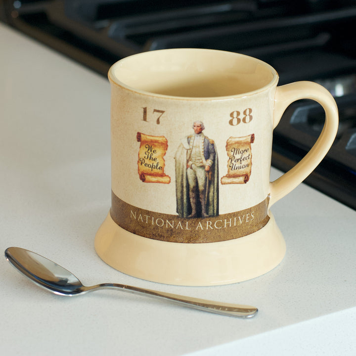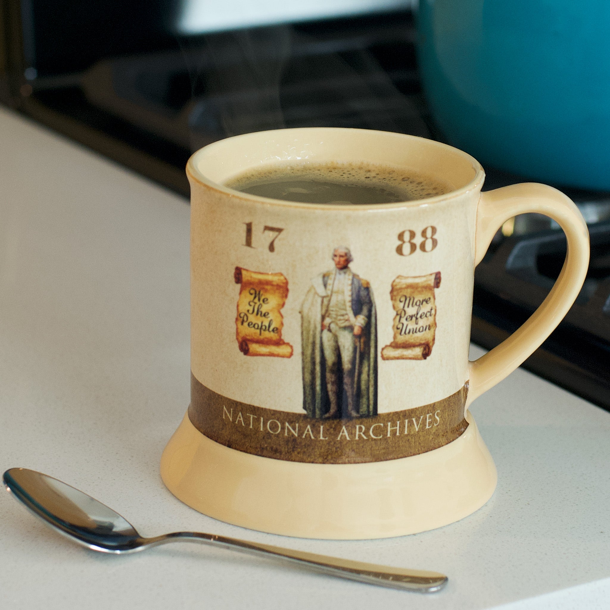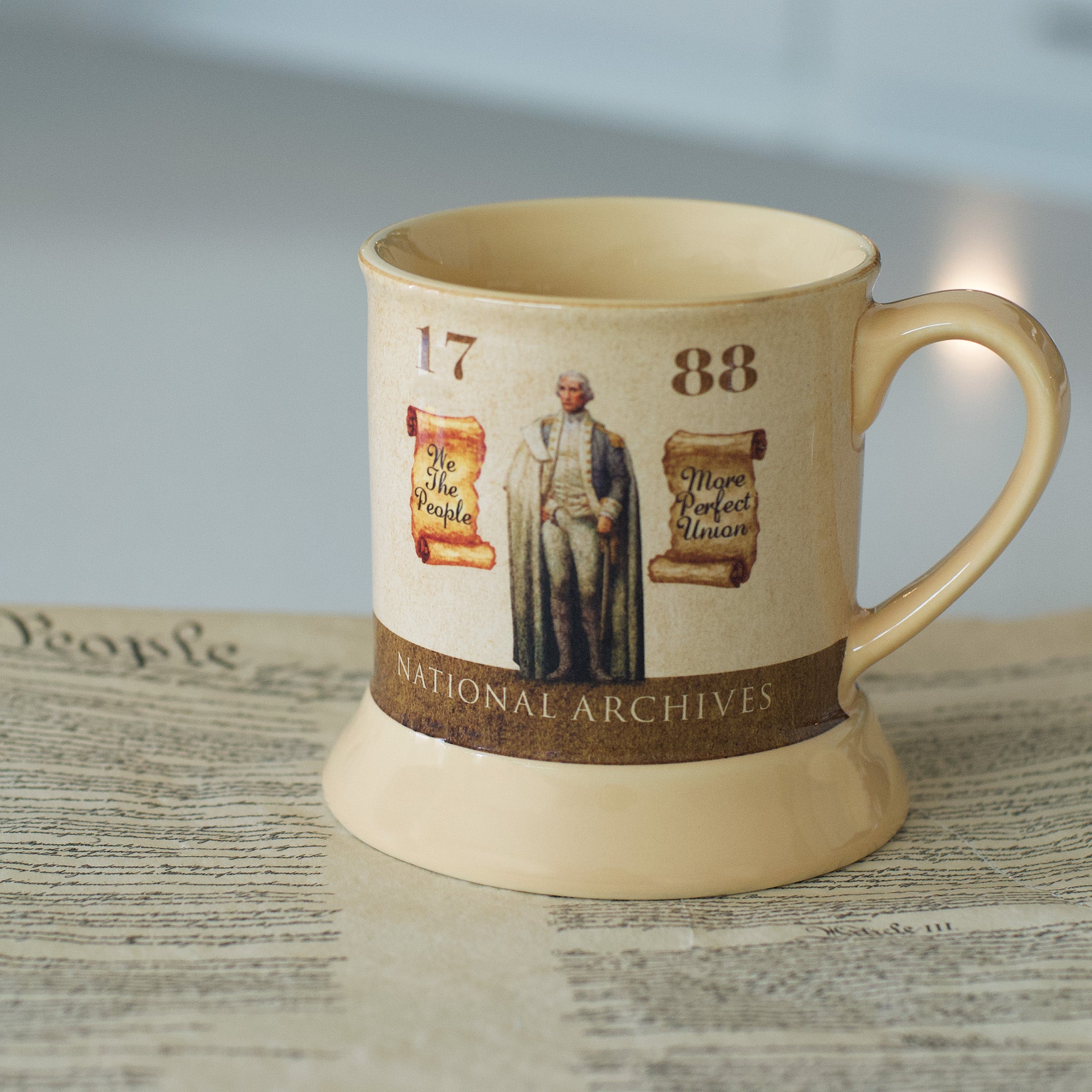 • Inspired by National Archives Rotunda mural artist Barry Faulkner's representation of President of the Convention George Washington at the time of the Constitutional Convention, we are pleased to offer our Tavern Mug. Raise a toast to the 1788 ratification of the Constitution, to the pursuit of a more perfect union and to our freedoms as Americans, when you enjoy a frothy beverage, a hot one, or even a cup of soup from this custom piece.