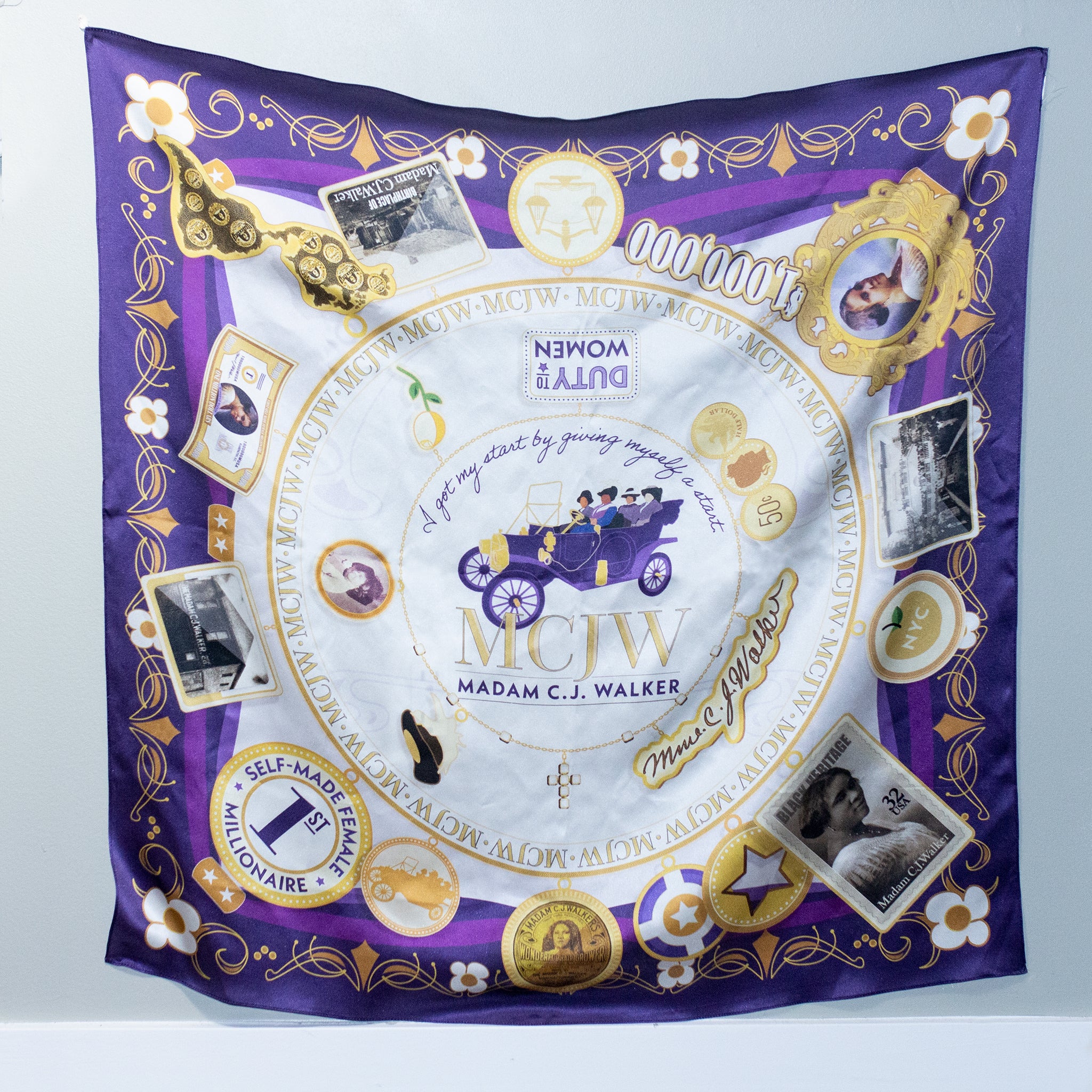 Centered around an illustration of the iconic Ford Model T owned by Madam Walker, images on the scarf depict events and components from her life story, appearing as charms on a bracelet and a necklace resembling one of Walker’s own. Together they showcase a truly remarkable life, which we proudly commemorate with this beautiful gift piece (or treasure for yourself).