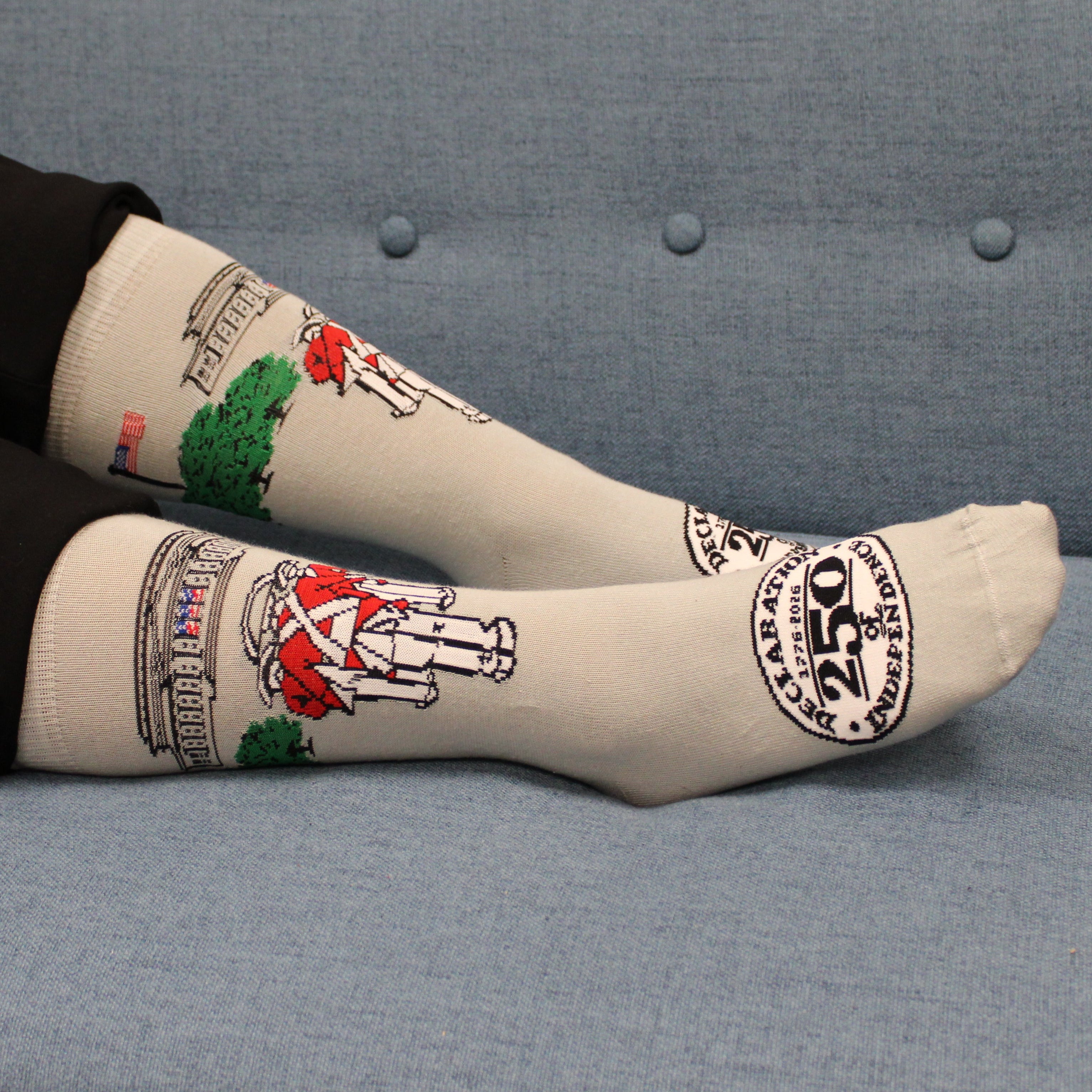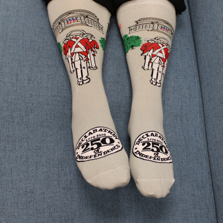 Step boldly into history with every stride. Our commemorative Declaration 250 crew socks honor America's 250th anniversary with a timeless design: the Old Guard Fife and Drums marching proudly before the National Archives Building—home of the Declaration of Independence. Inspired by the precision of Revolutionary-era musicians (who kept morale high during long marches), these light grey socks are crafted for comfort and patriotism. Made in the U.S.A.