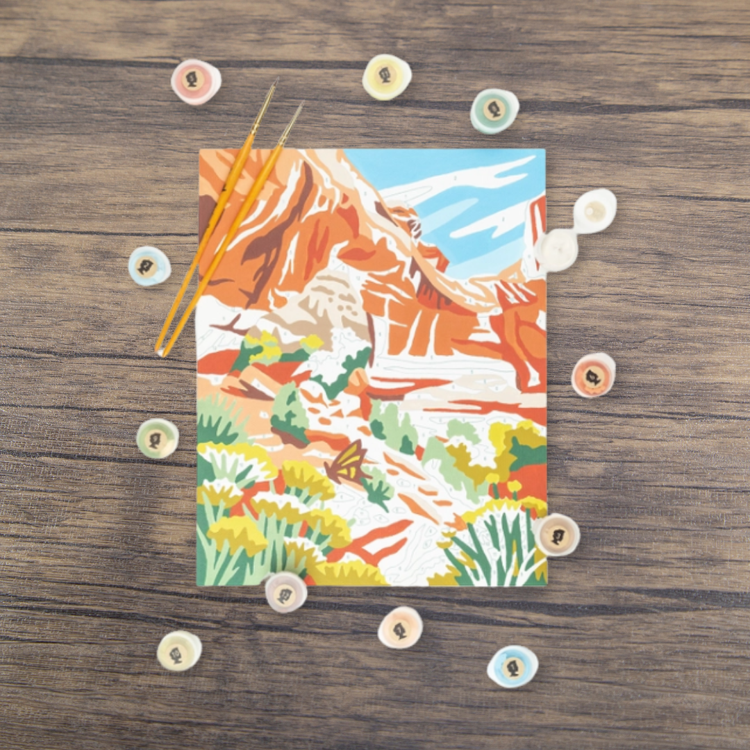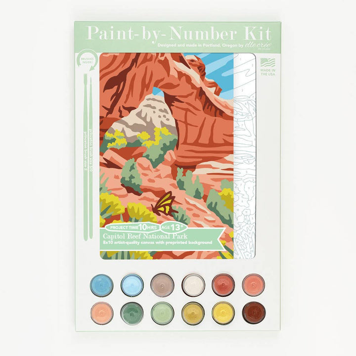 Our Capitol Reef National Park paint-by-number kit showcases the magnificent Hickman Bridge - a natural formation that spans 133 feet, making it one of the largest rock spans in the park. The yellow Chamisa flowers blooming in the landscape are also known as Rabbit Brush, and nestled in the brush is a butterfly sipping a drop of nectar. With instructions for painting, the canvas is ready for stunning details to be filled in. This kit includes everything needed to create a beautiful piece of handmade home decor, and hours of satisfying creativity.