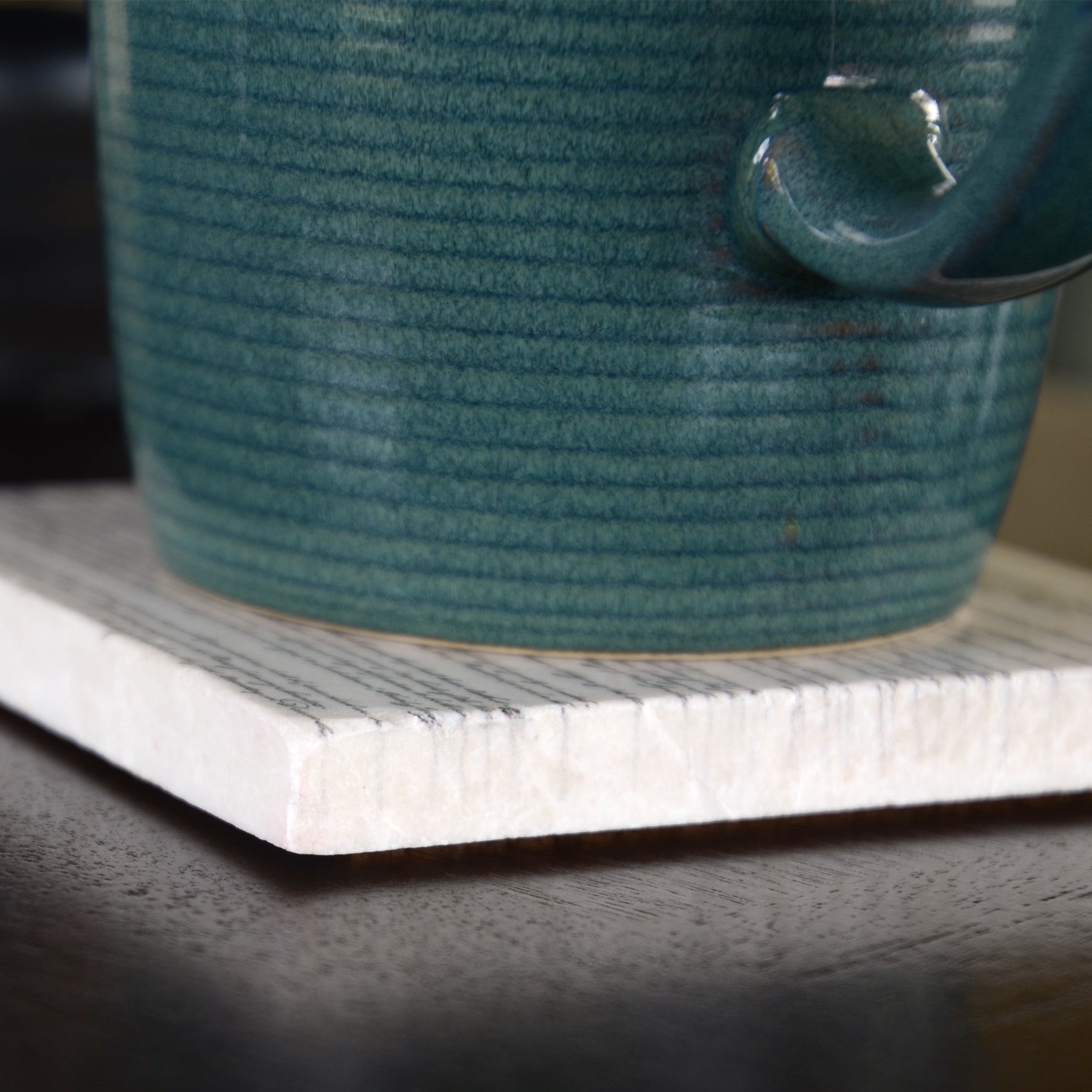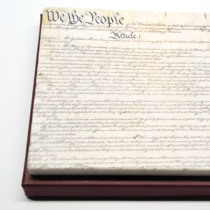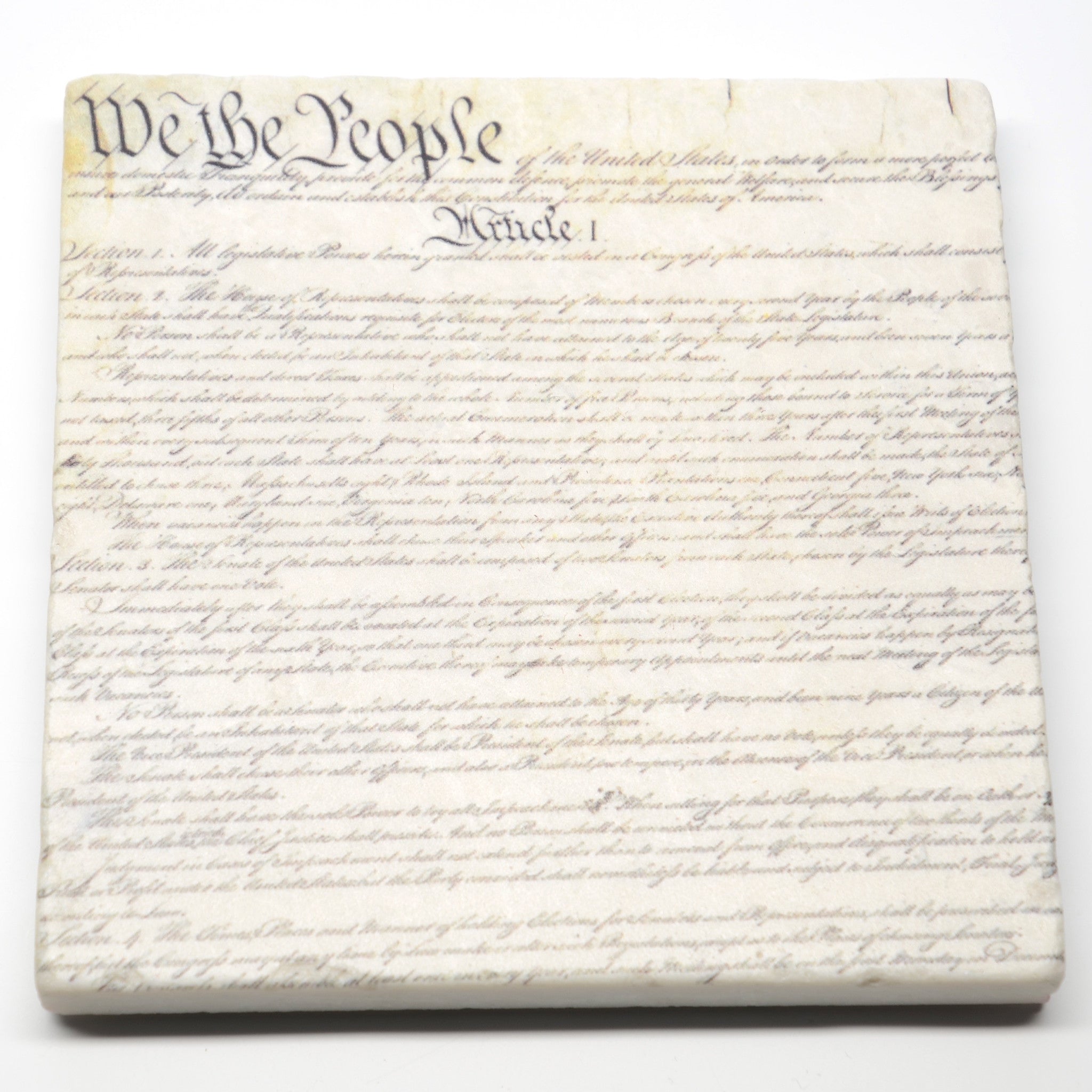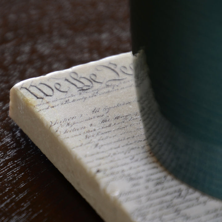 "We the People," beautifully engrossed by Jacob Shallus on the first page of the Constitution, has become a symbol of who we are as Americans. Here the first page of the Constitution is elegantly screened on hand-selected, one-of-a-kind marble coasters. Perfect for both the home and office.
