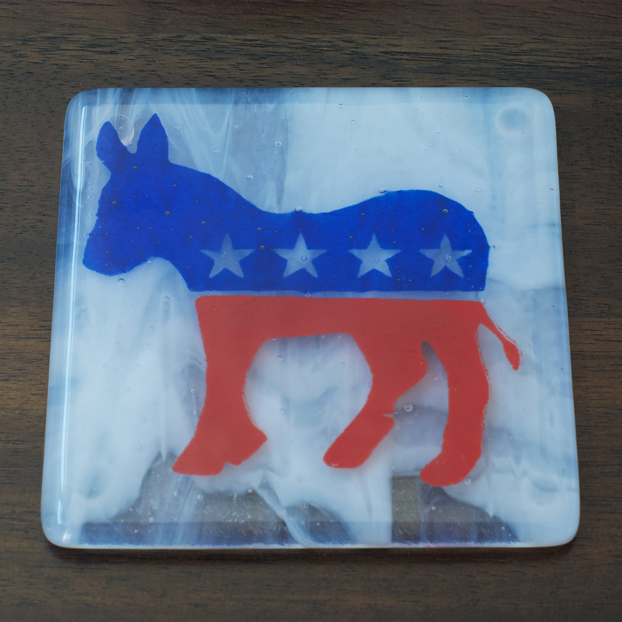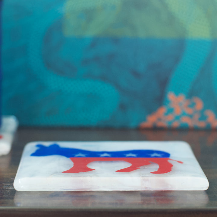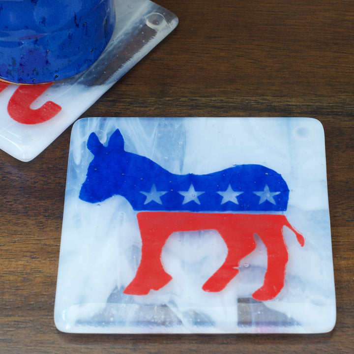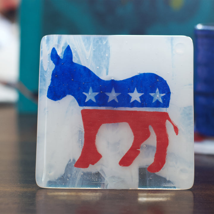 This beautiful glass coaster showcasing the Democratic Donkey is a stunning piece of artistry, crafted with exquisite care and attention to detail. The coaster is made of milky white to clear glass, polished to a high sheen. A vivid image of the Democratic Donkey is hand-screend onto the glass.