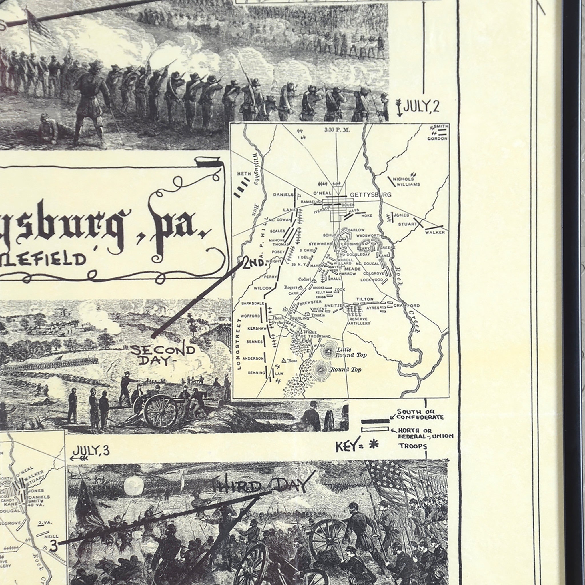 Depicting army positions of the battle of Gettysburg, this authentic reproduction is printed on antiqued parchment paper. As the battle waged over July 1, 2, and 3 of 1863, the Union and Confederate armies suffered the largest number of casualties of the entire war. This is often described as the war's turning point.