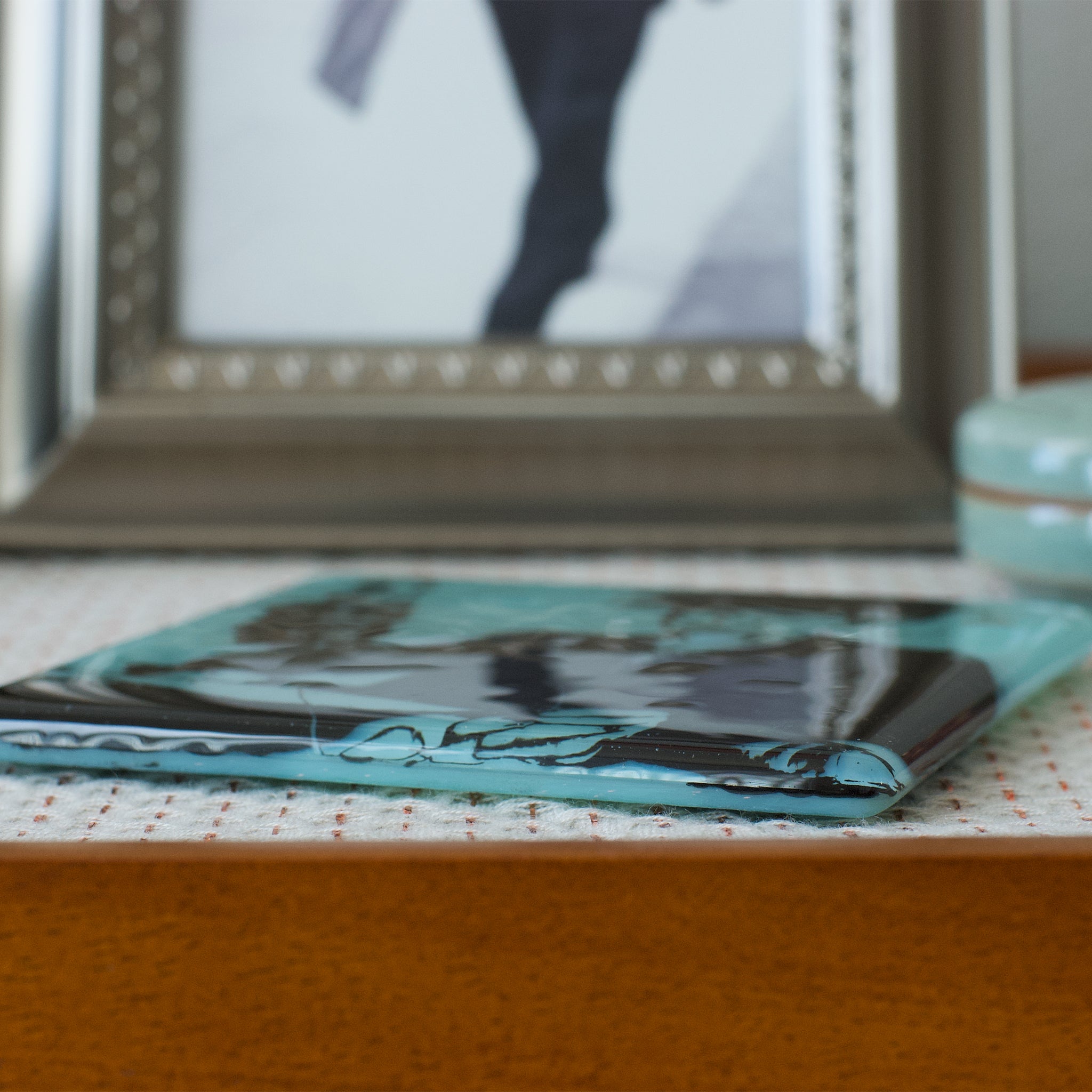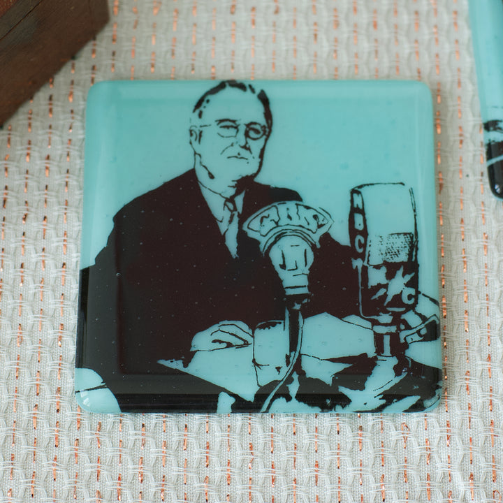 This exquisite glass coaster features a hand-screened scene of the 32nd President of the United States, Franklin Delano Roosevelt, at the NBC Fireside Chat. The coaster is of polished green glass, with black imagery. Crafted with care to withstand the heat of a hot drink, and protect your tabletop from stains and rings.