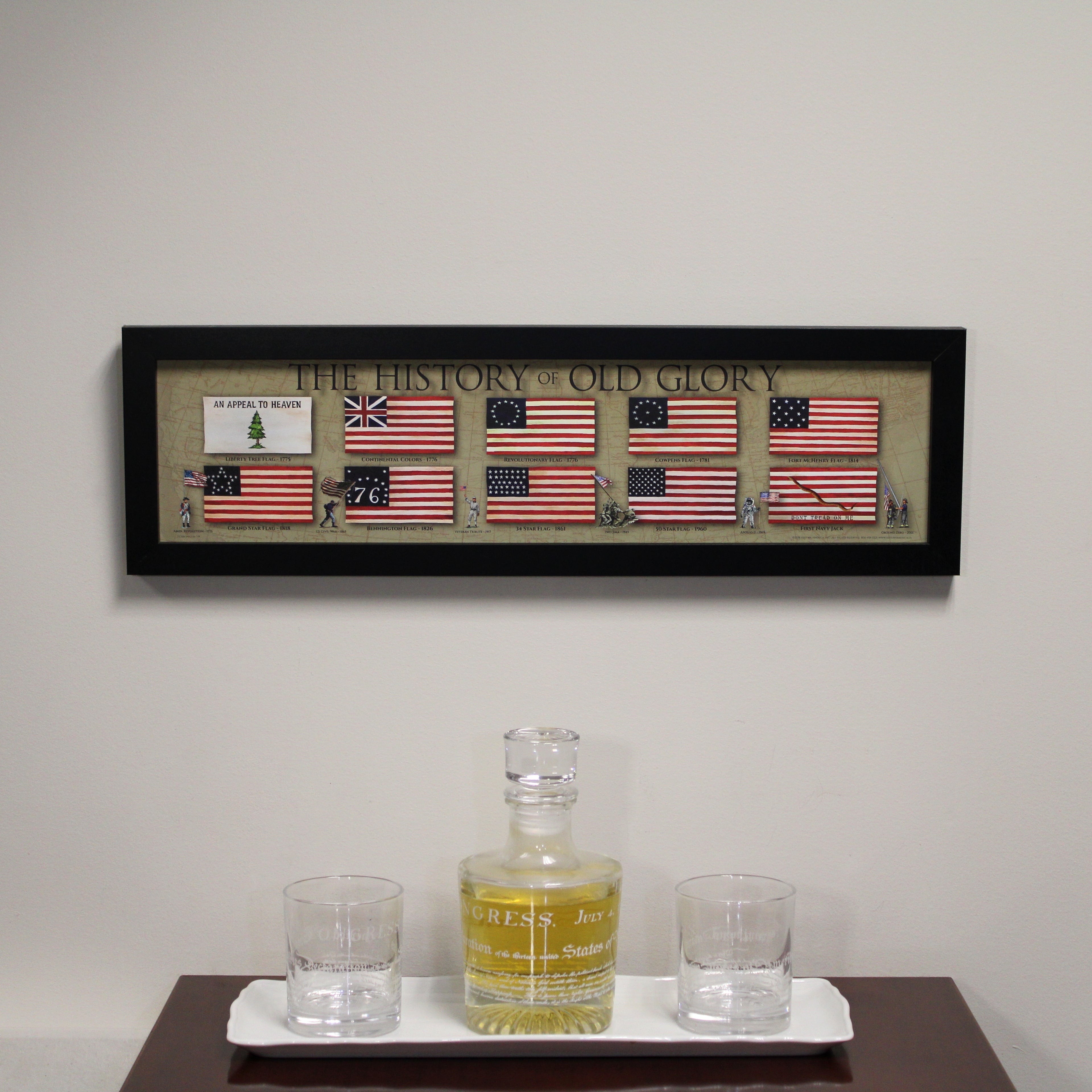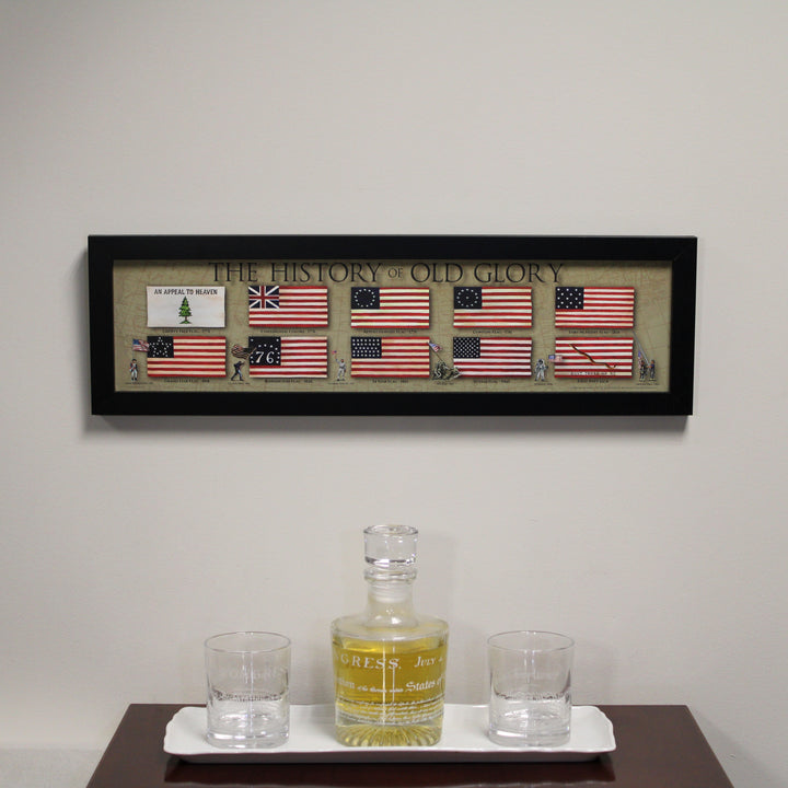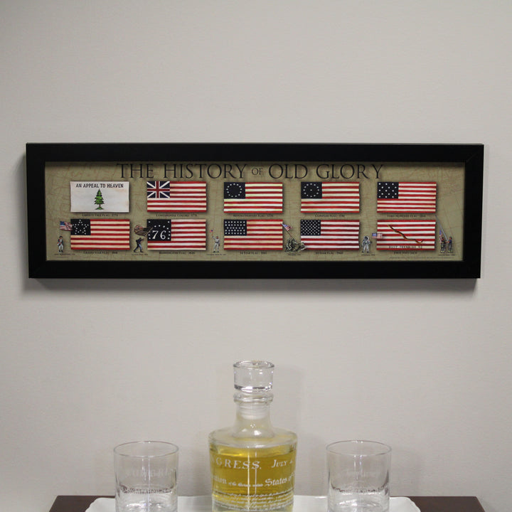 The History of Old Glory is showcased in this framed print, which depicts 10 versions of the American flag through time. They are in order from left to right, row by row: