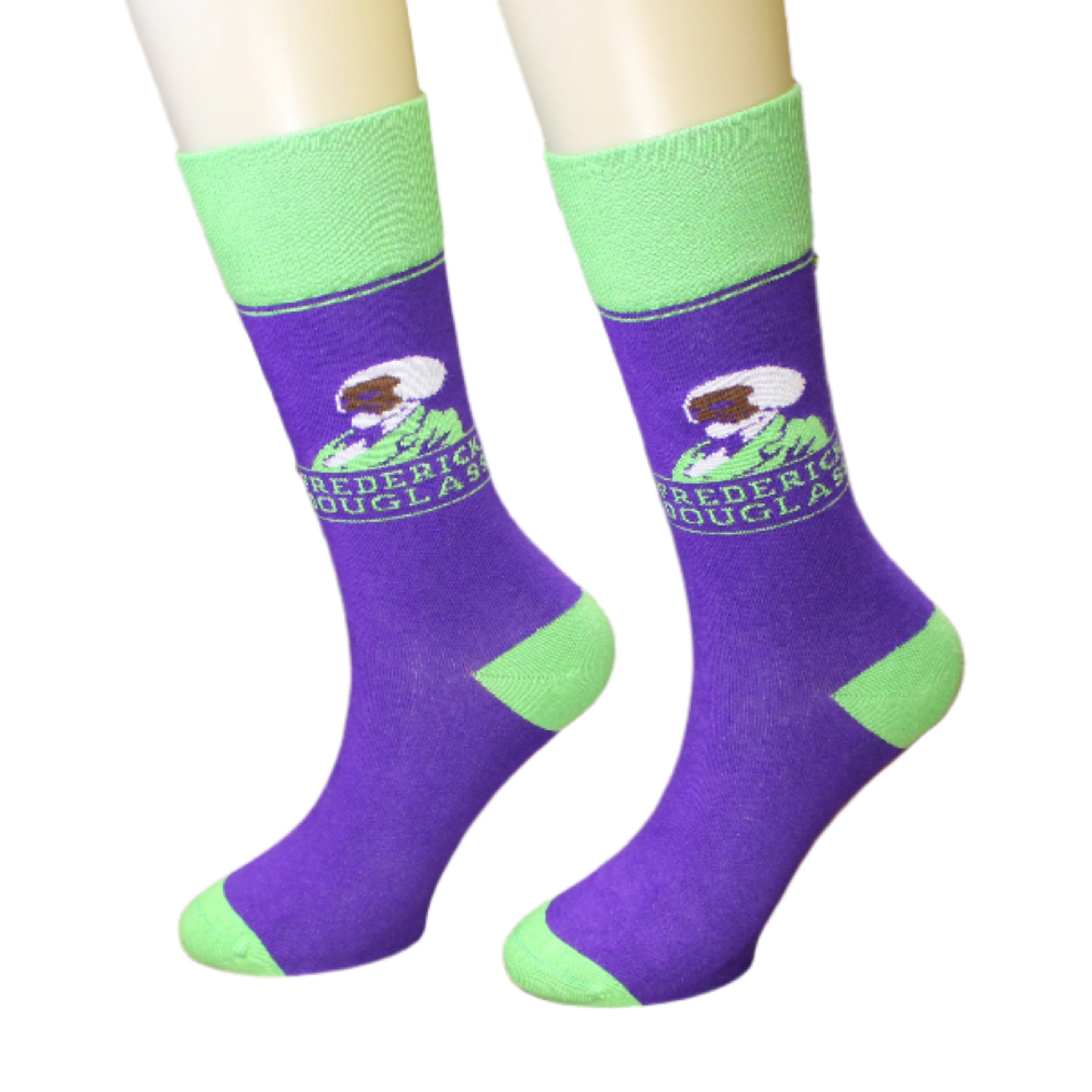 These stylish and historically significant crew socks feature bright green accents that beautifully highlight the portrait of prominent African American social reformer, abolitionist, orator, writer, and statesman Frederick Douglass. Exuding his legendary determination and wisdom, Douglass' portrait is woven into the socks and shows him gazing intently ahead. A rich purple hue base color serves as a fitting background.