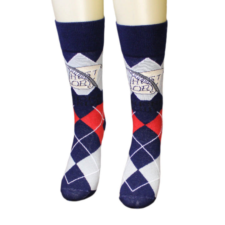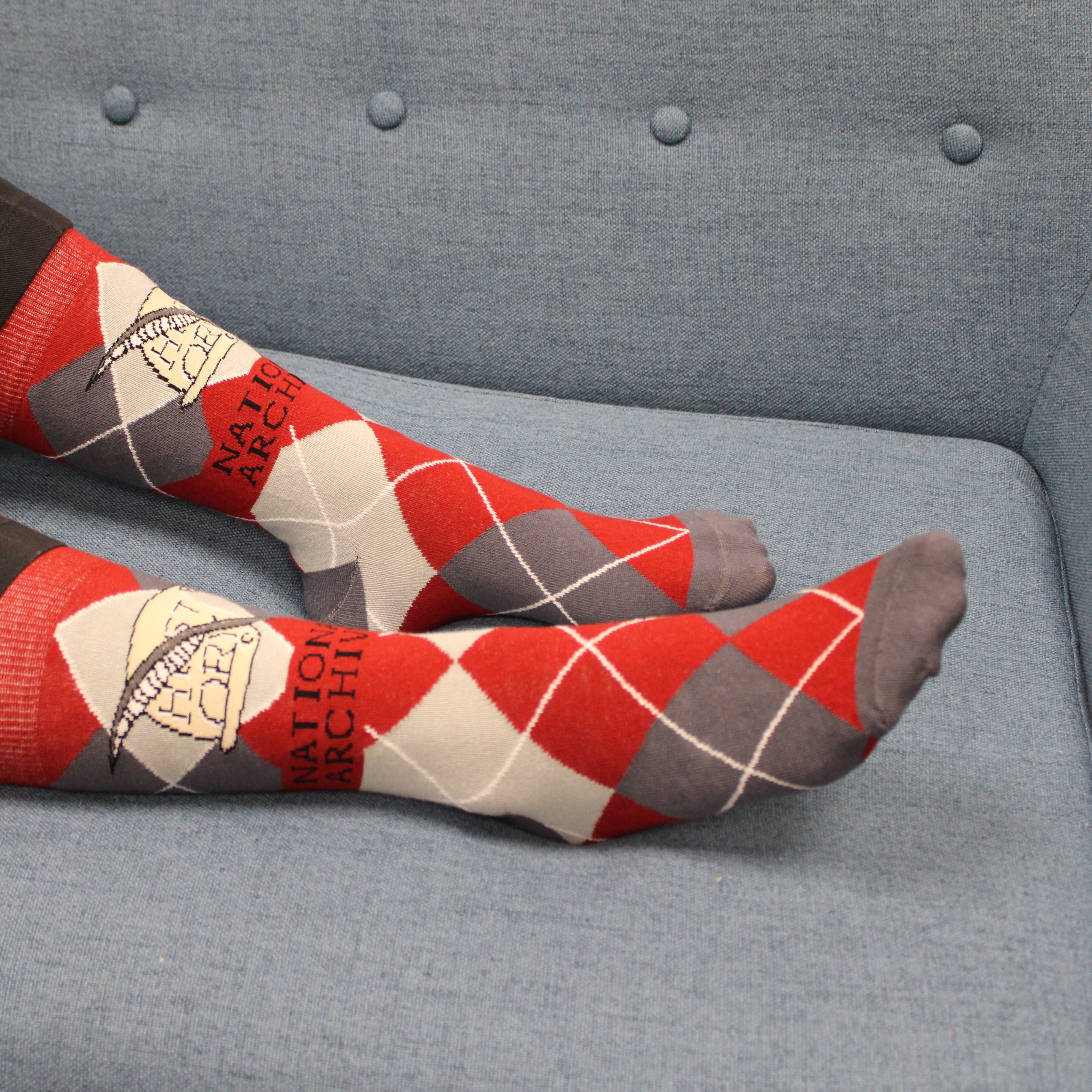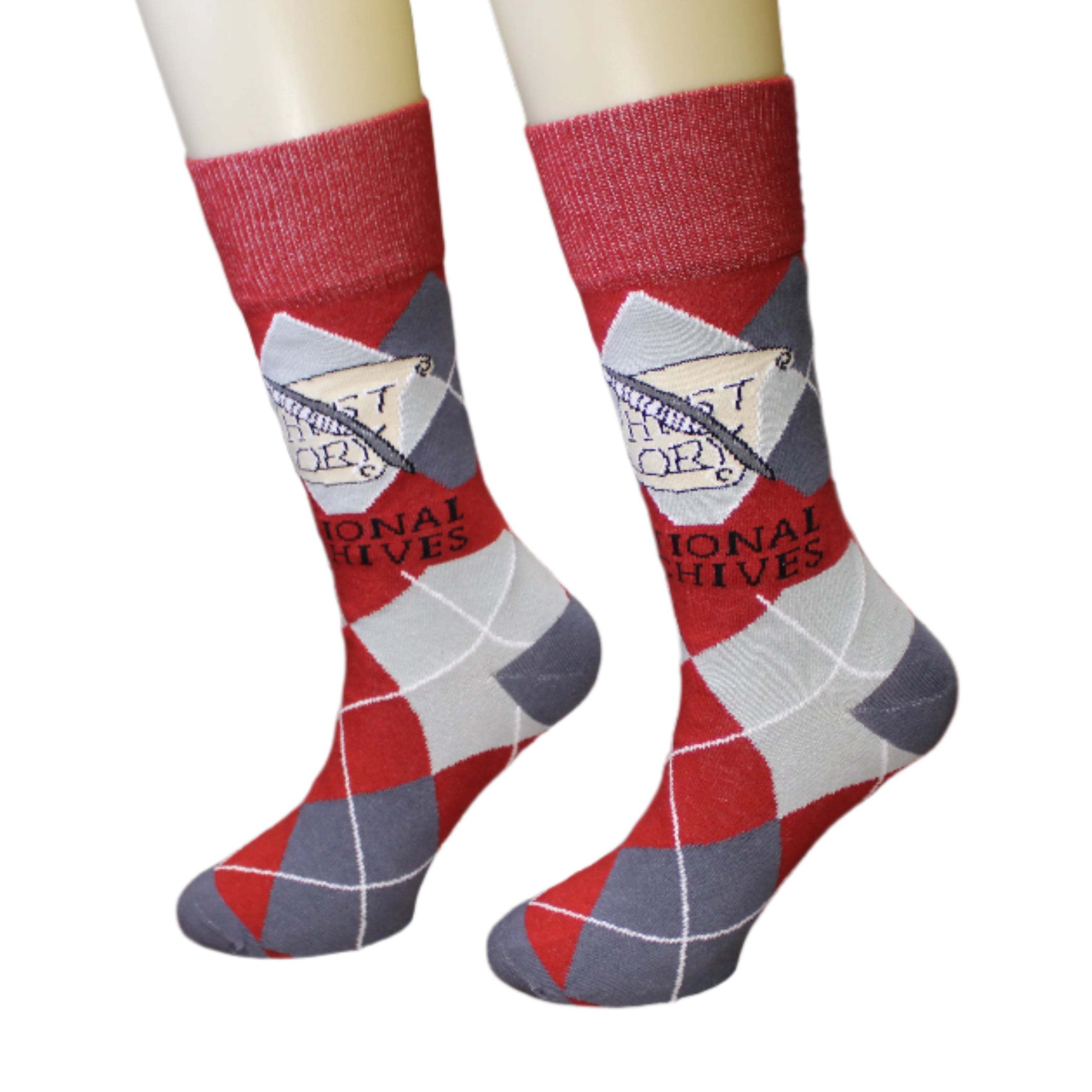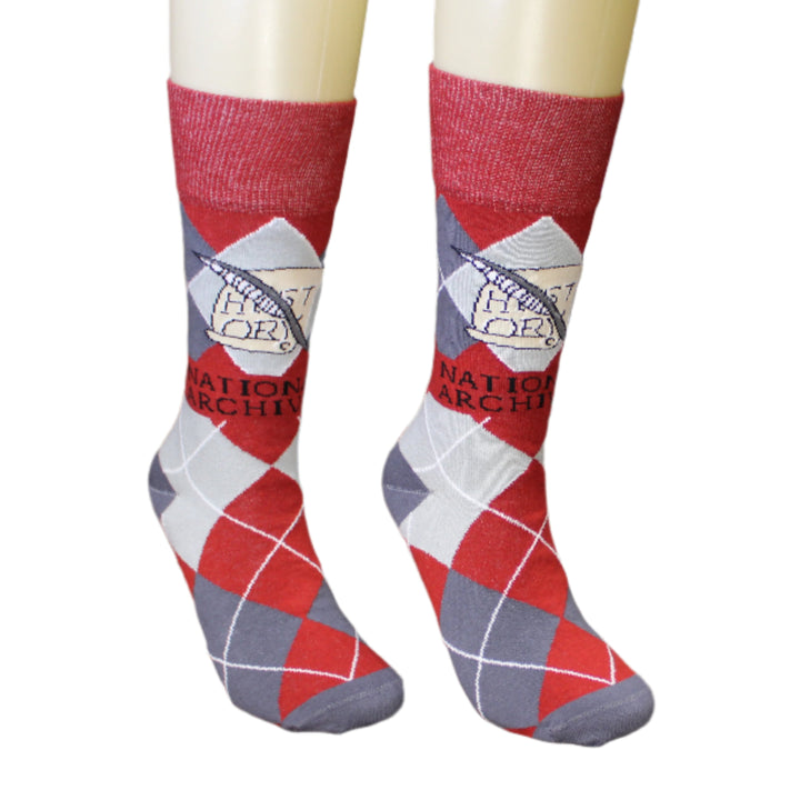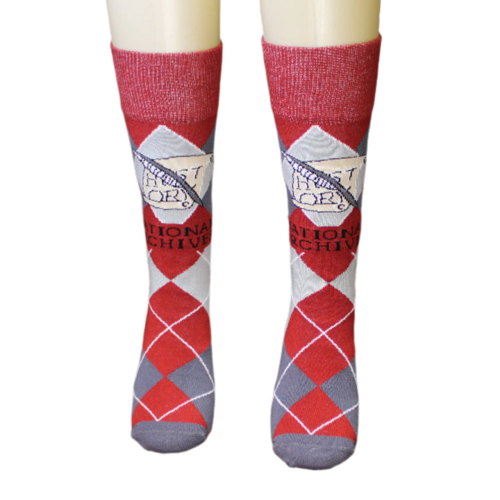These socks feature two classics: an argyle pattern, which never seems to go out of style; and a scroll detail featuring the word "history," along with a quill. This design is inspired by a section of a large bronze floor medallion set inside the Rotunda of the Charters of Freedom. It is located right in front of the steps leading inside the gallery featuring the founding documents: the Declaration of Independence, United States Constitution, and the Bill of Rights. The medallion represents the branches of government.