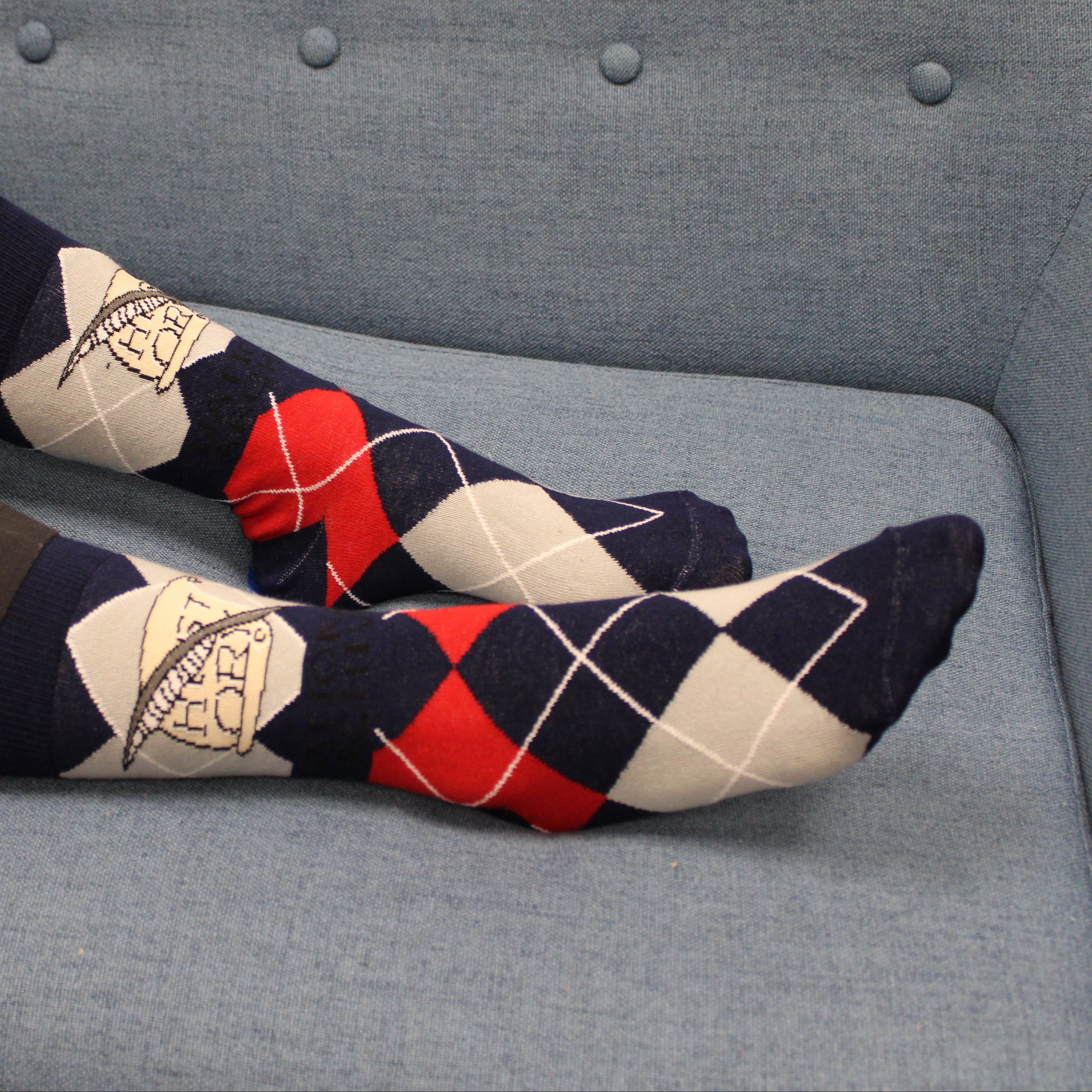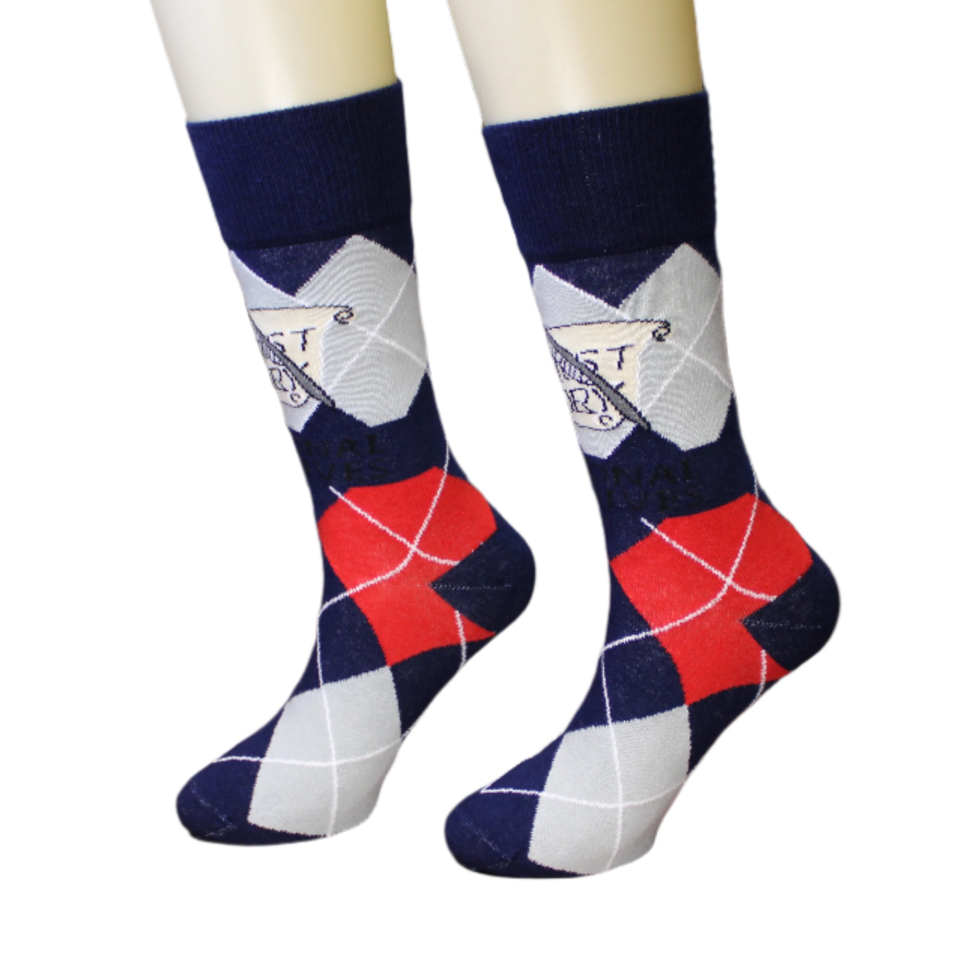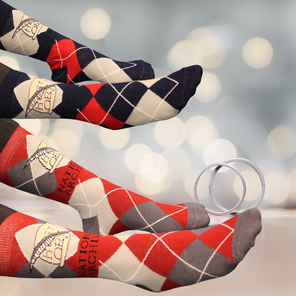 These socks feature two classics: an argyle pattern, which never seems to go out of style; and a scroll detail featuring the word "history," along with a quill. This design is inspired by a section of a large bronze floor medallion set inside the Rotunda of the Charters of Freedom. It is located right in front of the steps leading inside the gallery featuring the founding documents: the Declaration of Independence, United States Constitution, and the Bill of Rights. The medallion represents the branches of government.