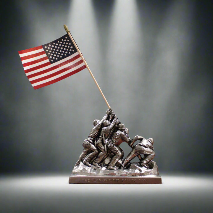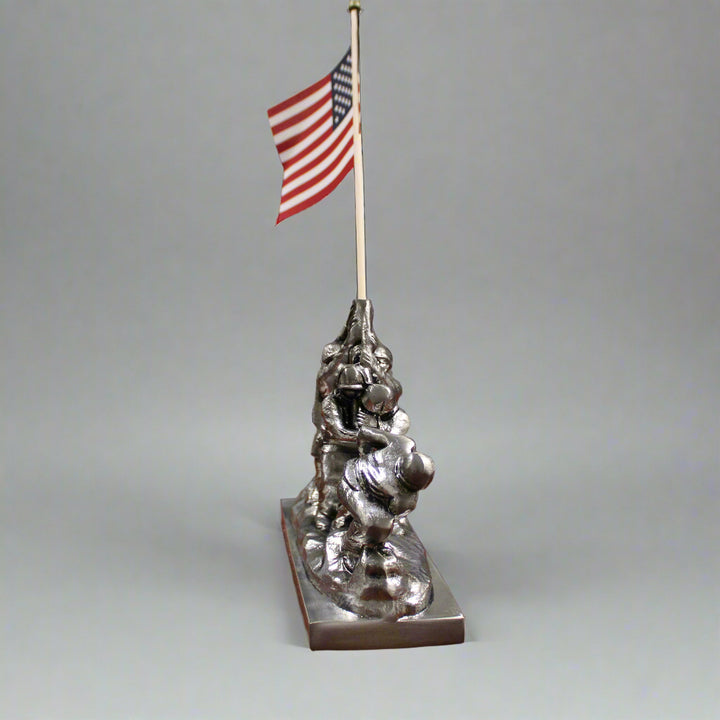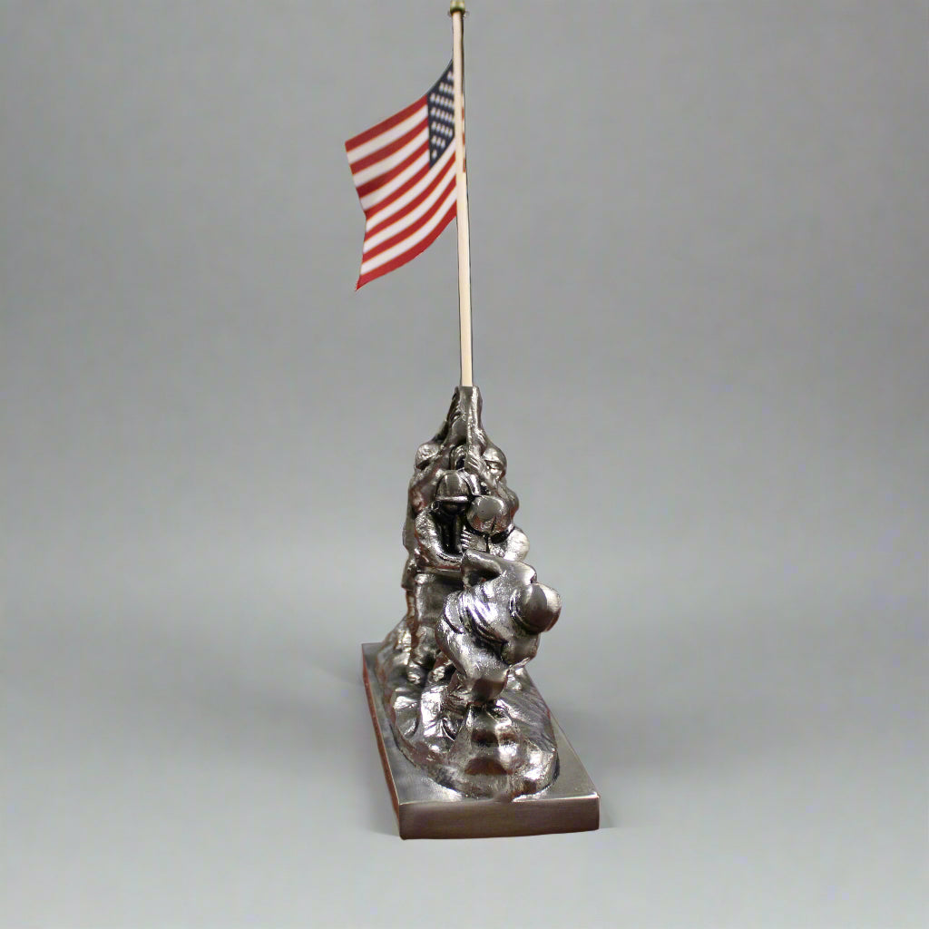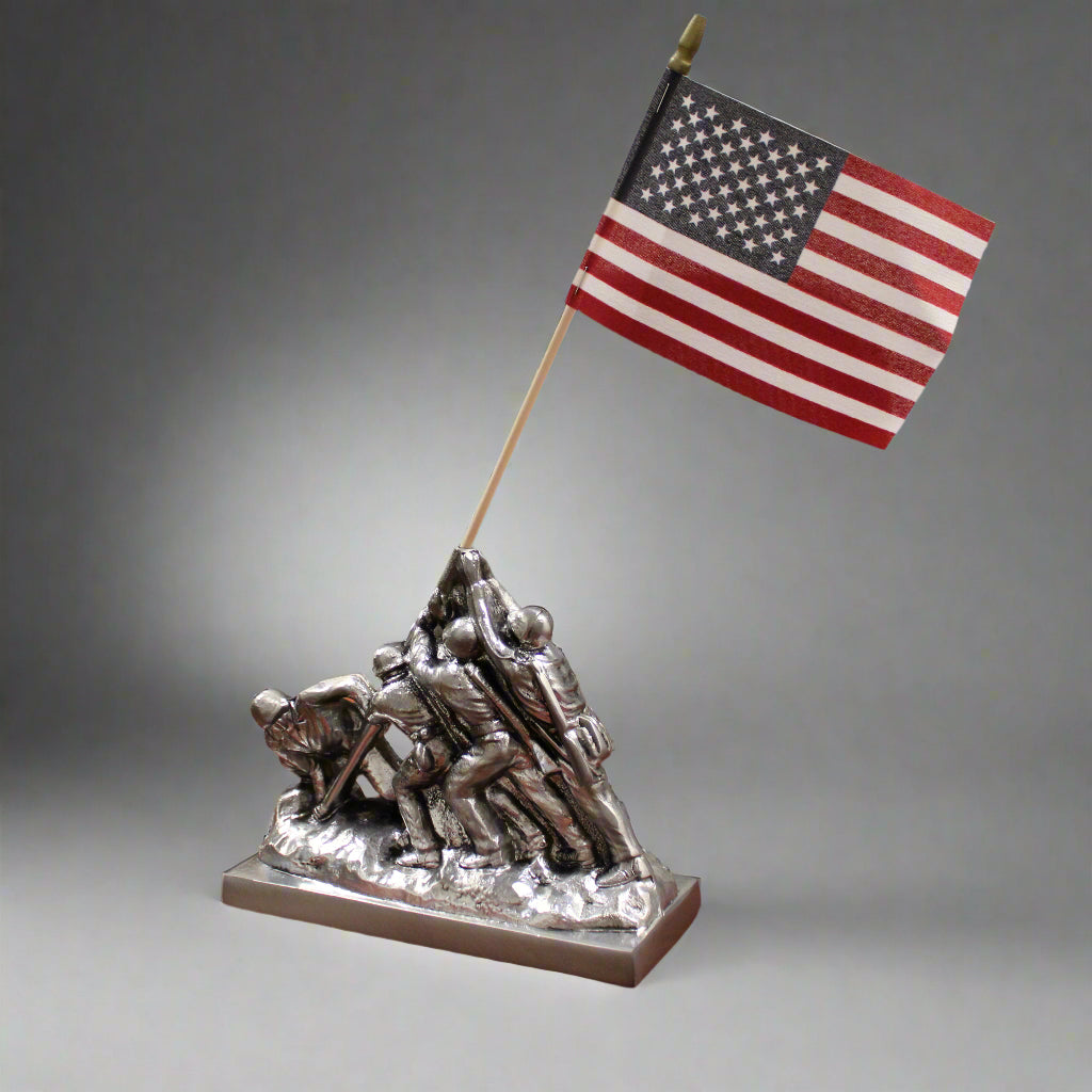 Our cast pewter sculpture of the raising of the flag on Iwo Jima is a stirring piece that evokes the grandeur of the colossal sculpture at the U.S. Marine Corps War Memorial in Arlington, Virginia. We invite you to commemorate the Marines with us, with this remarkable sculpture and star spangled banner.