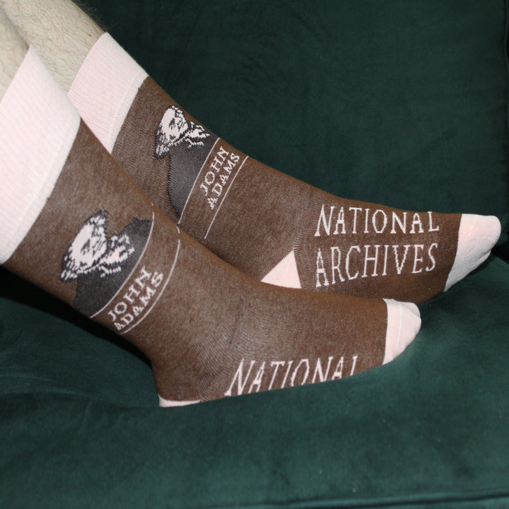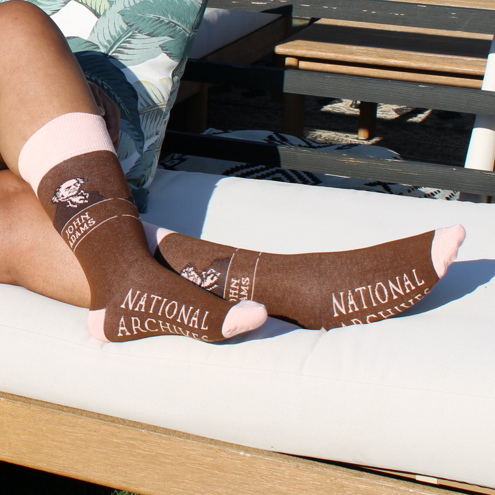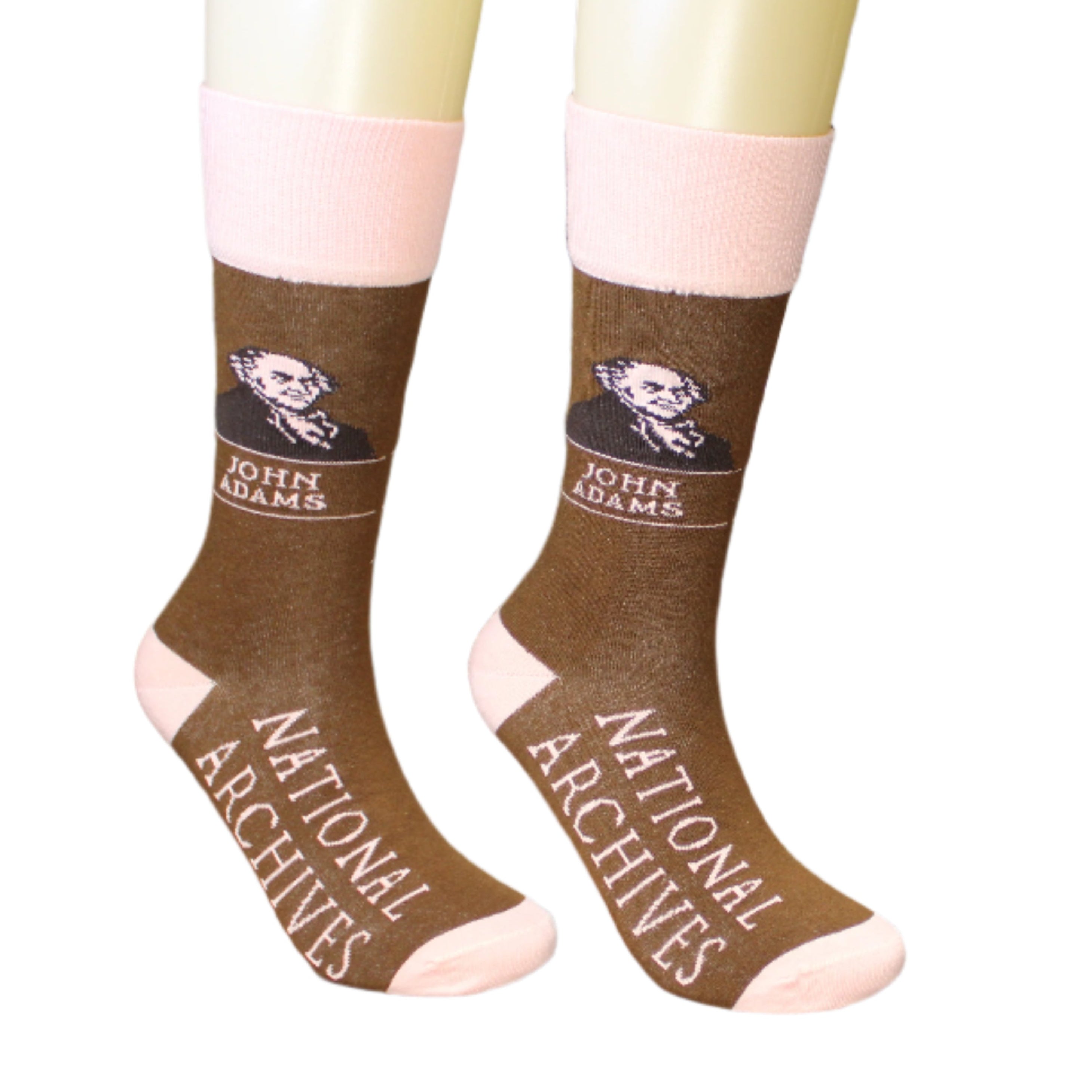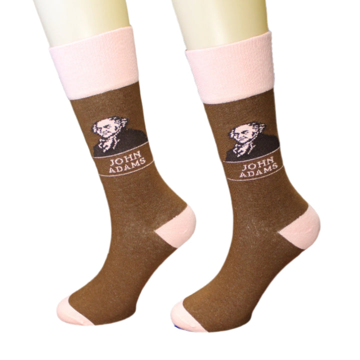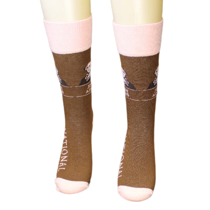 • These delightful brown-base crew socks add a touch of elegance and playfulness to your everyday outfit. A portrait of John Adams, the second President of the United States of America, is the centerpiece, set against soft-pink-colored accents on the cuff, heel, and toes. His distinguished features and signature powdered wig are expertly rendered, making these socks a true work of art for history buffs and fashion enthusiasts alike.