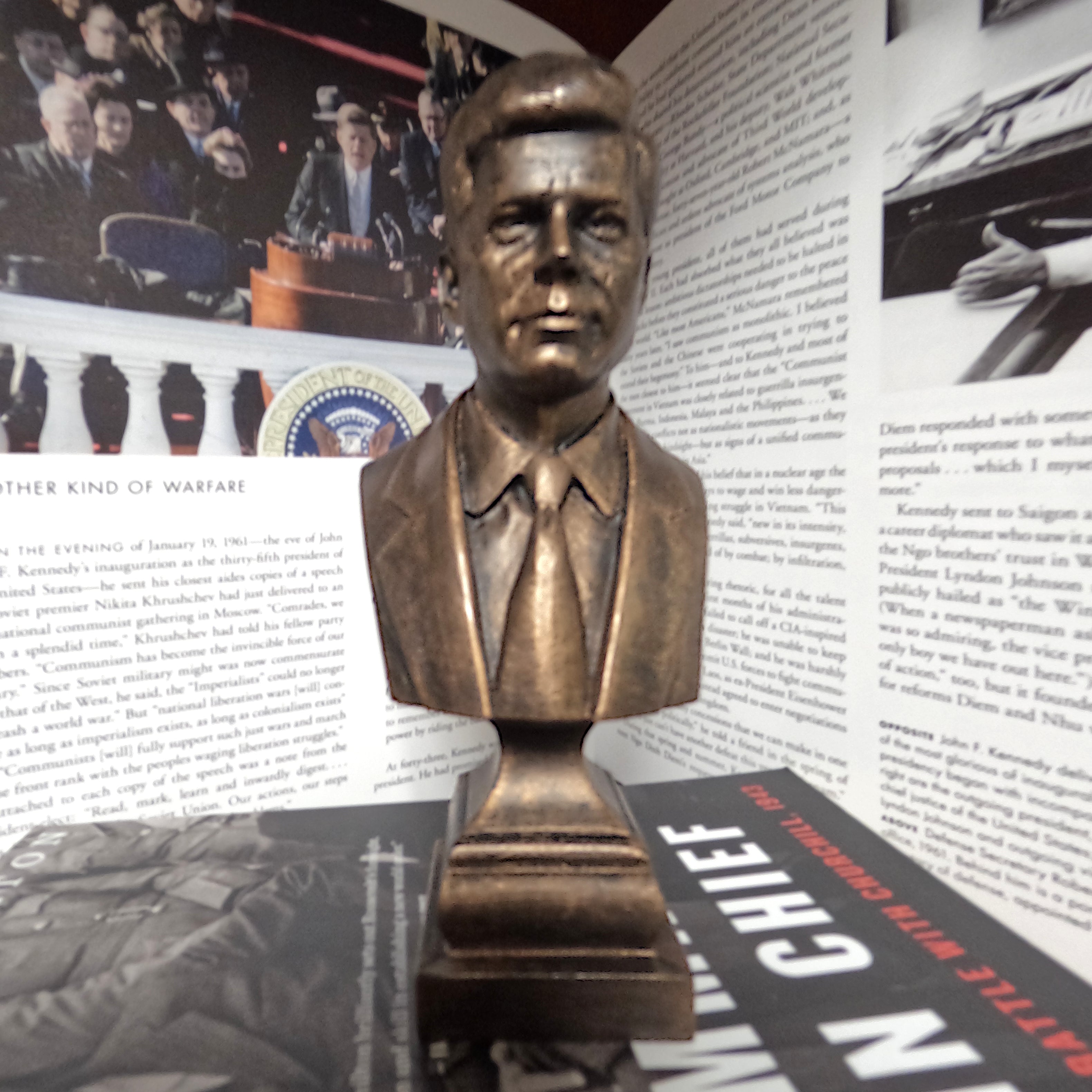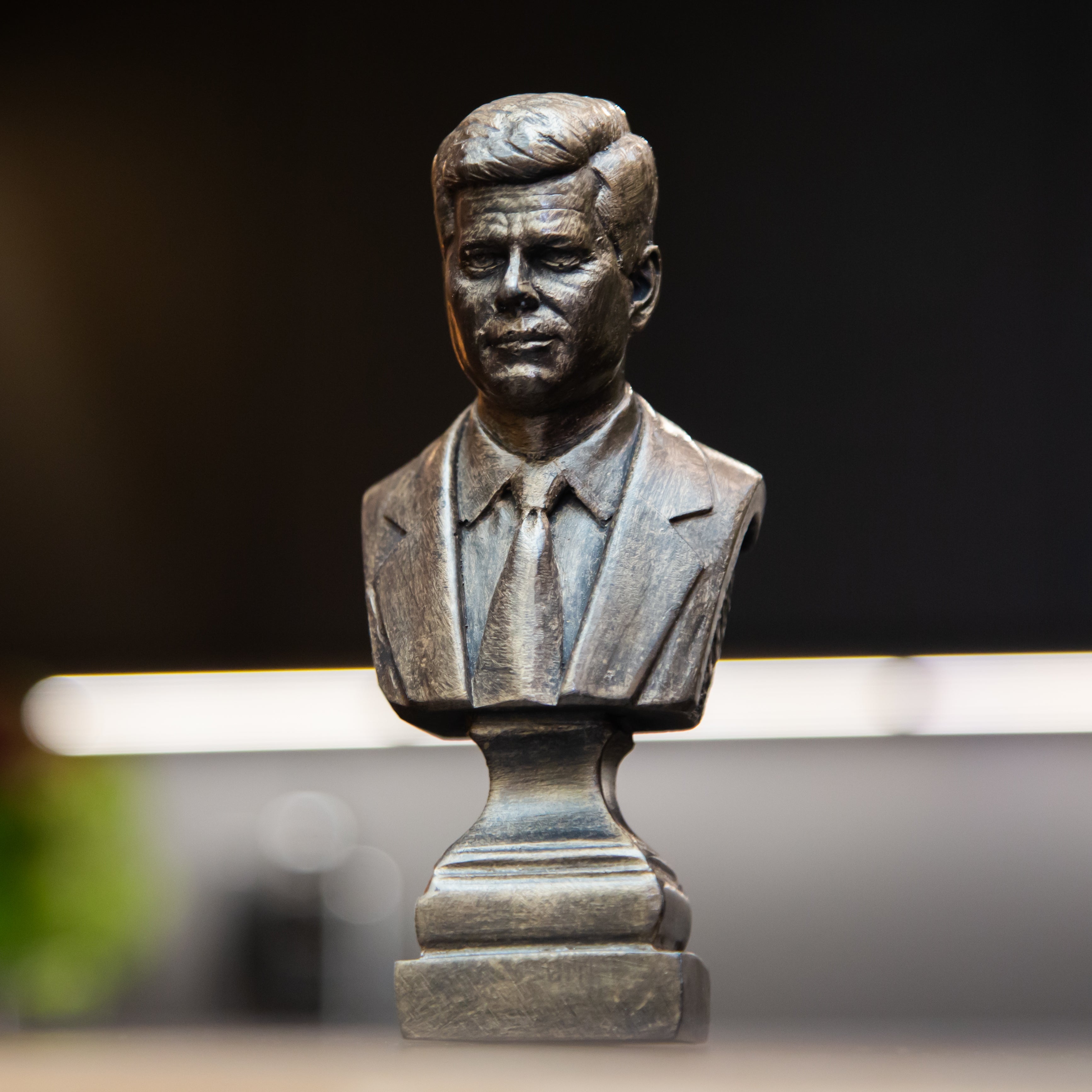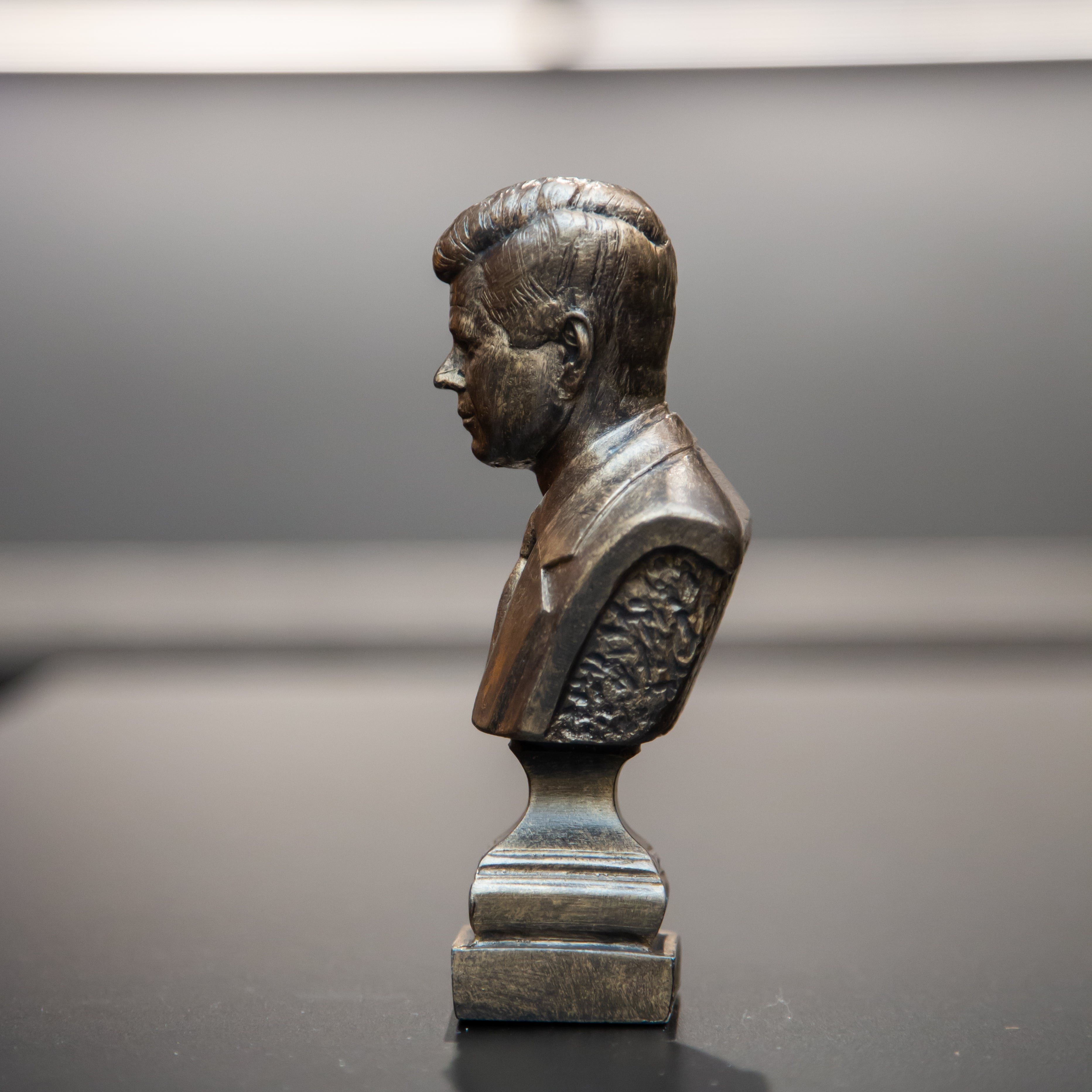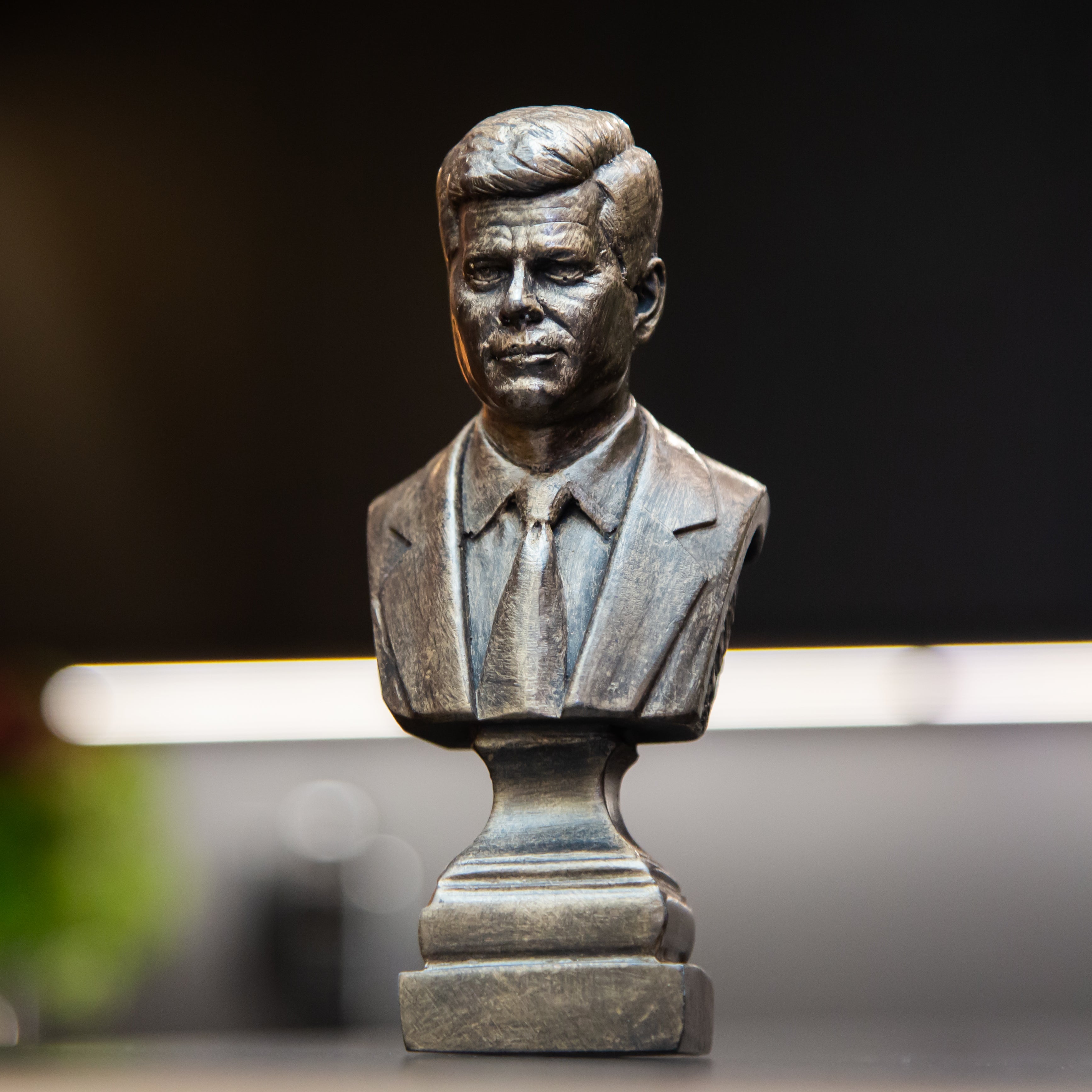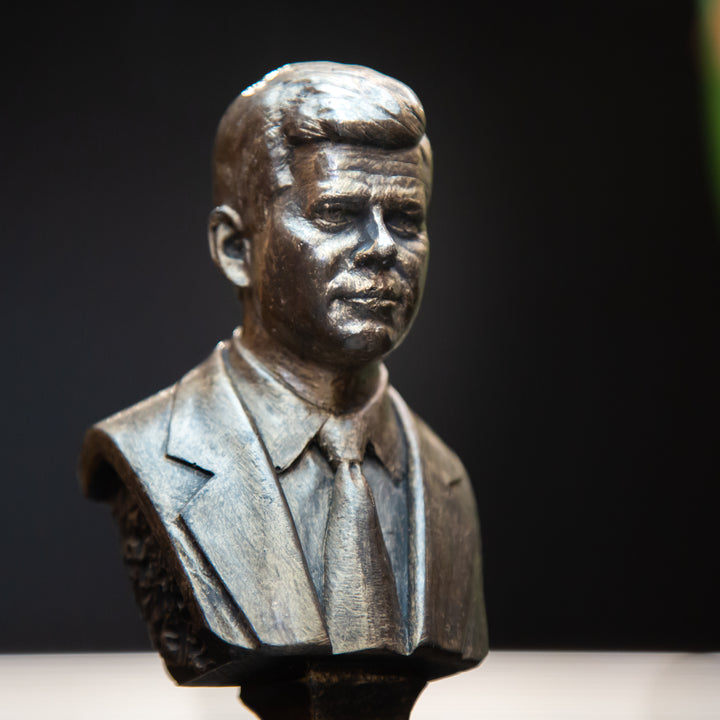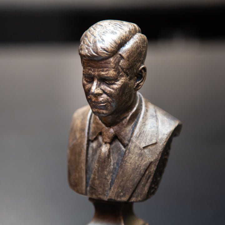 This handsome bust of President John F. Kennedy is just the right size for a desk or accent shelf. It is cast of bronze-colored polystone. The underside of the base features a short biography and quote from Kennedy's famous inaugural address, which reads, "Ask not what your country can do for you, ask what you can do for your country."