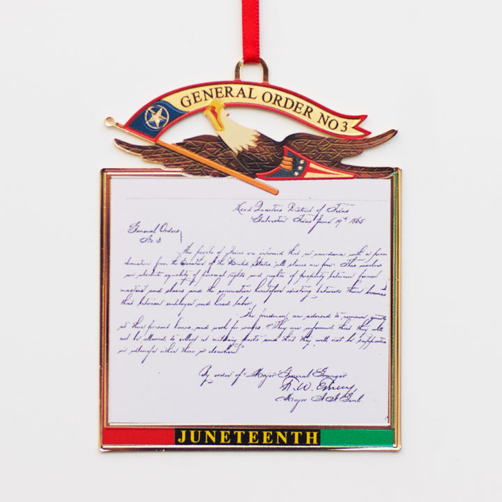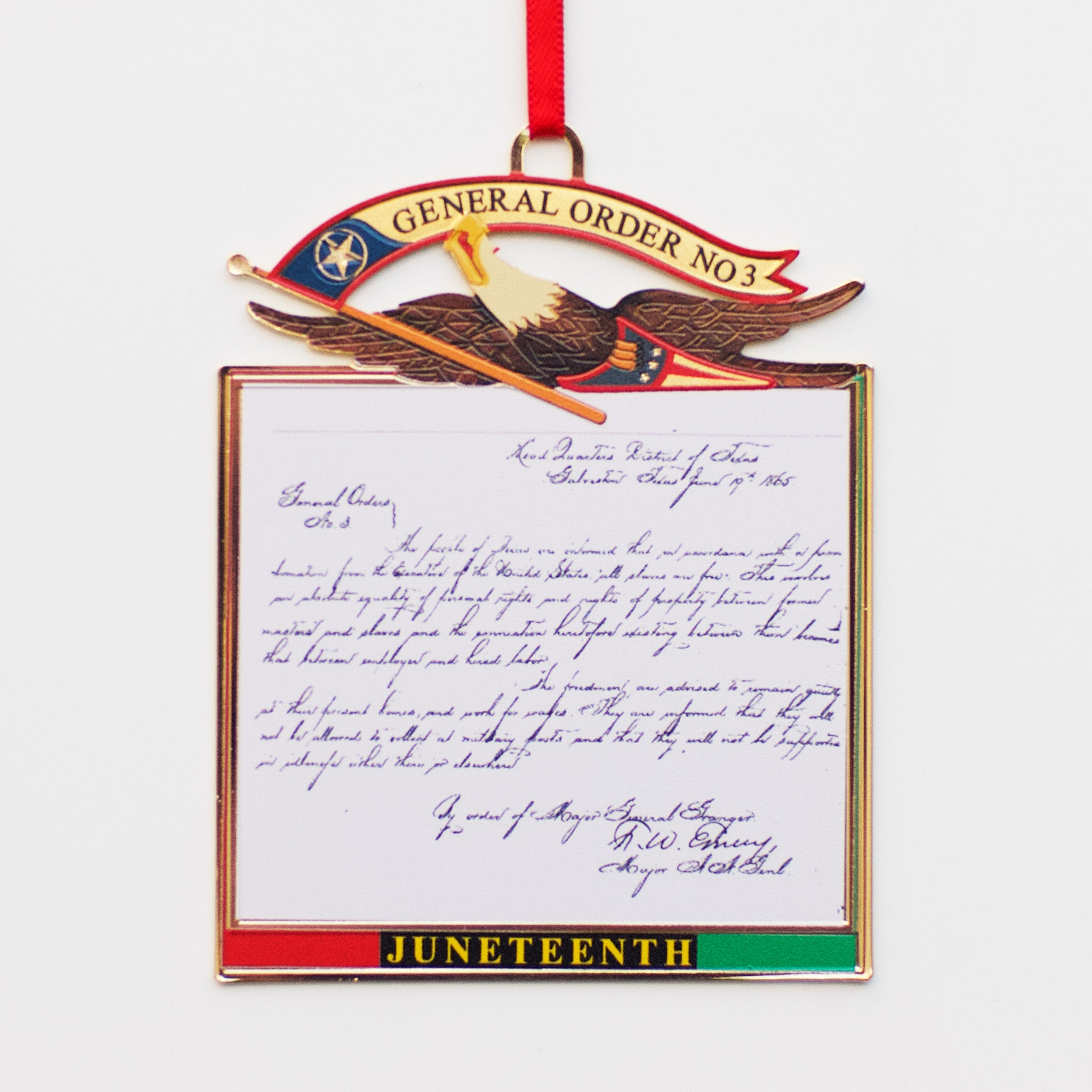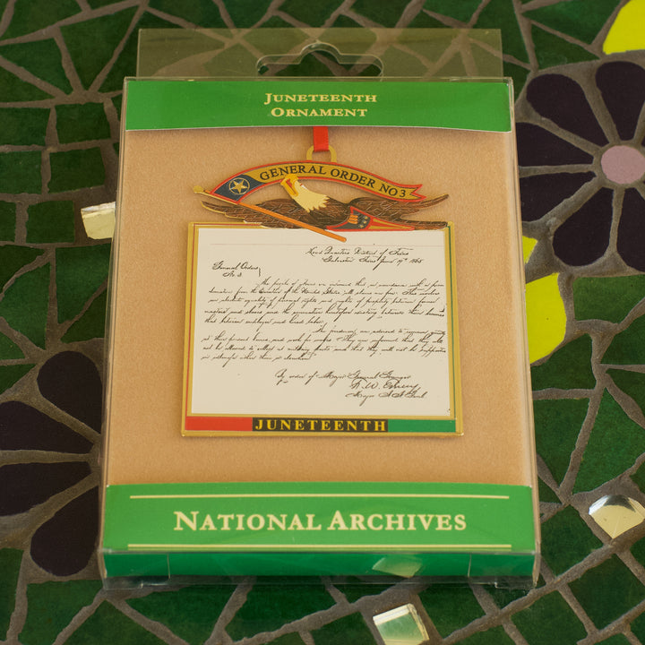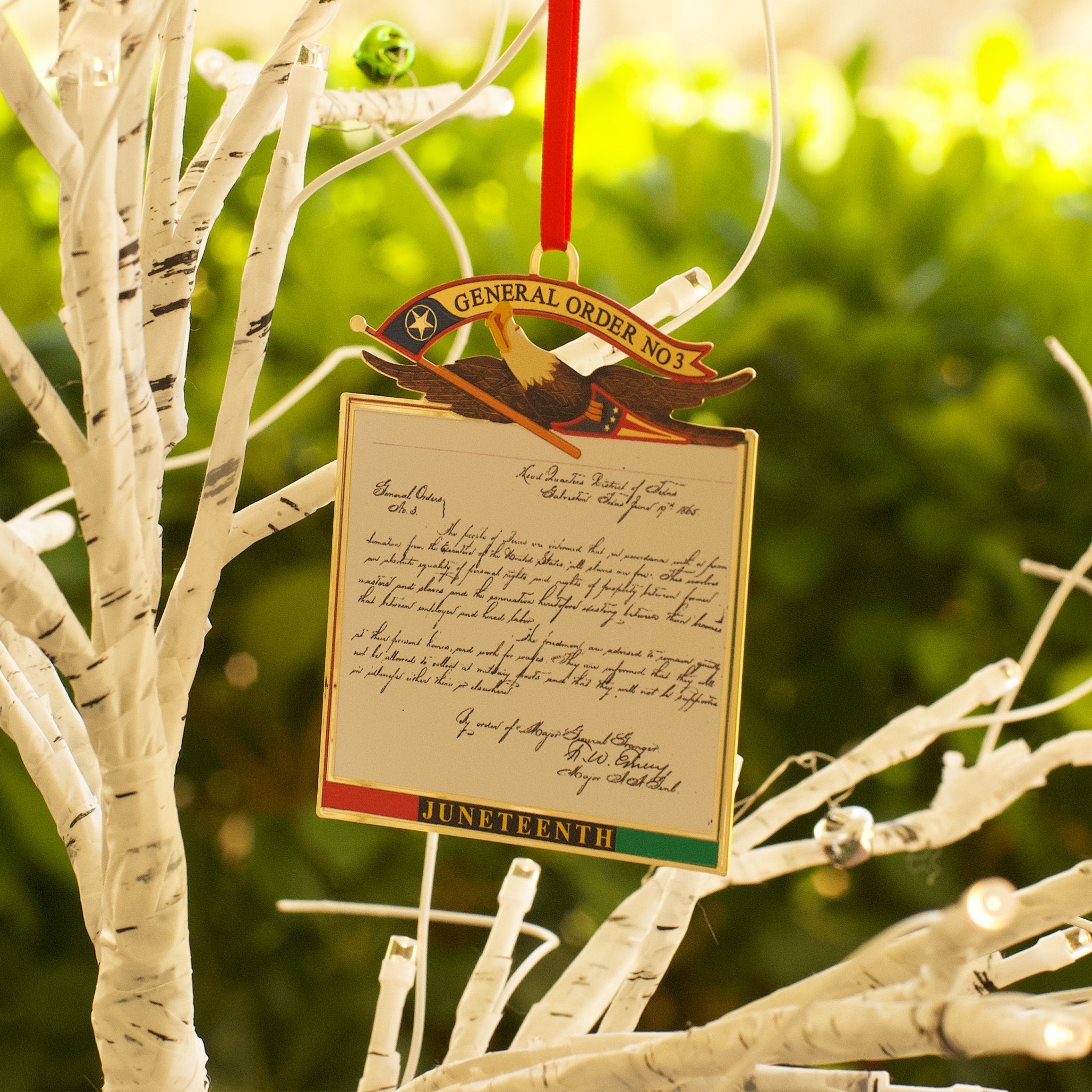 Exclusive to the National Archives Store, this detailed and vividly colored ornament was made in the United States. It depicts the handwritten record of General Order No. 3 which on June 19, 1865, announced to the people of Texas that all enslaved people were now free. This wonderful and distinguished decorative piece deserves to be shown at any time of year.