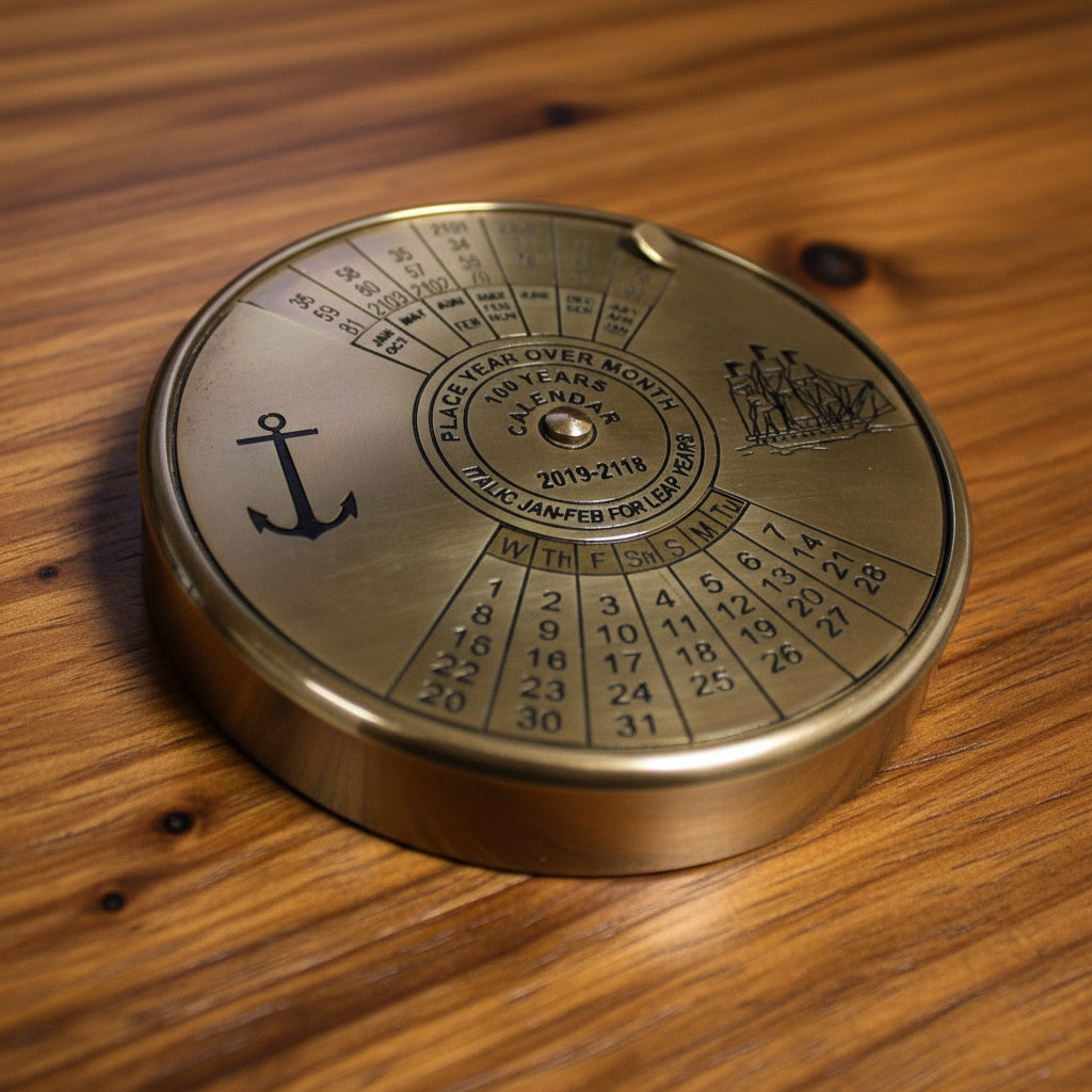 A calendar that will outlast the one in your cell phone, this polished brass piece makes a terrific gift. It is an early, simple pocket calculator that dates back some 500 years. To calculate the given date within a 100-year time span between 2019 and 2118, simply rotate the dial until the selected year lines up with the selected month. From there, the date and day of the week can be located below.