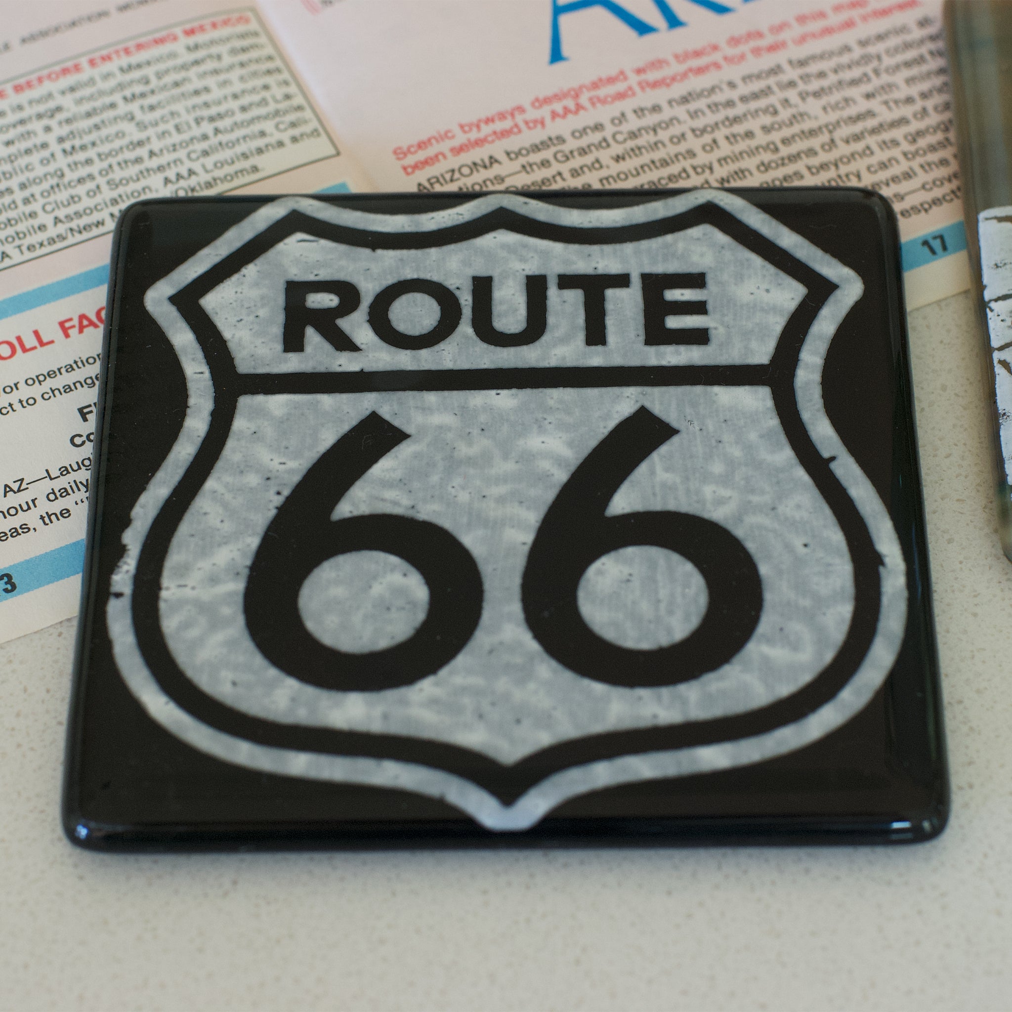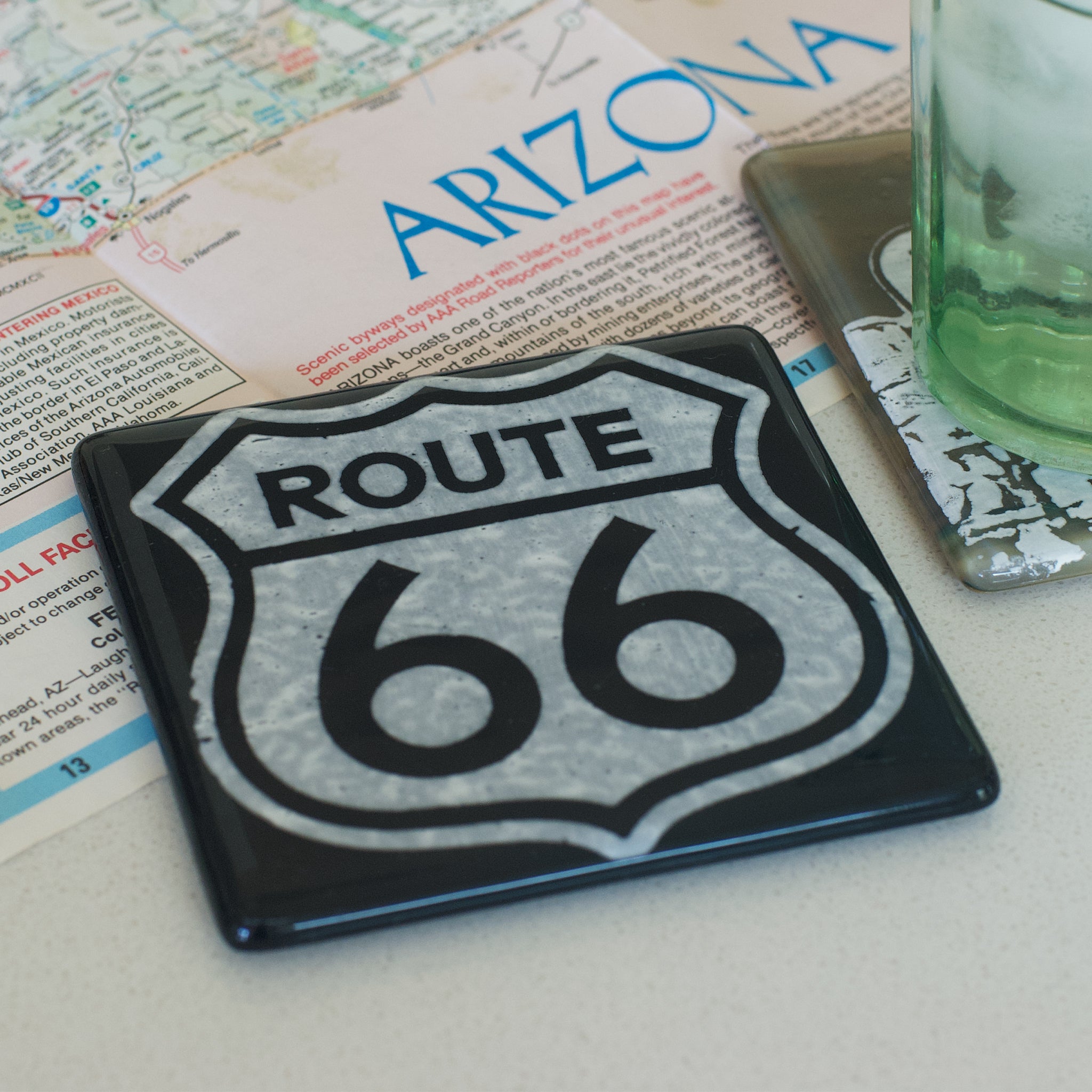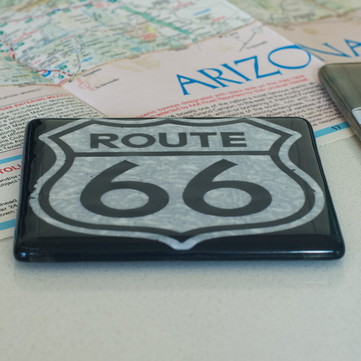 Our polished black glass coaster, adorned with the Route 66 road marker, is a beautiful tribute to that bygone era. The hand-screened design is timeless. It serves not only as a functional coaster to protect your surfaces from condensation but also as a decorative piece that speaks volumes about the owner's appreciation for Americana.
