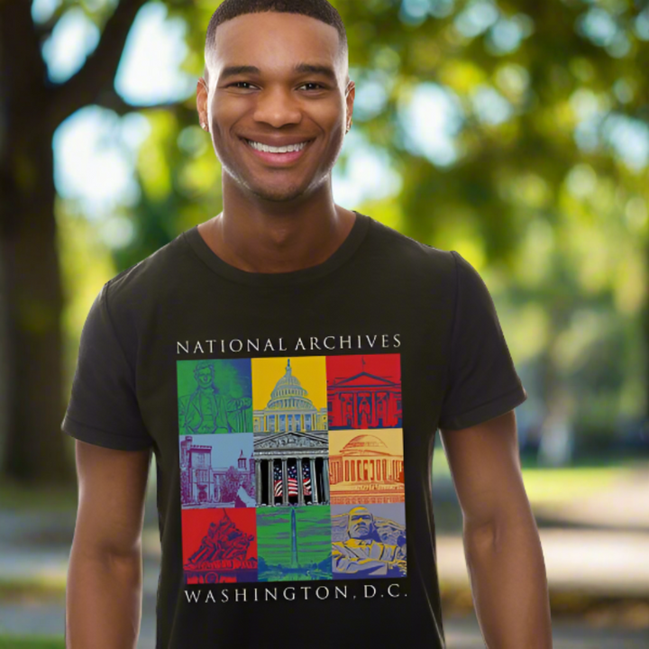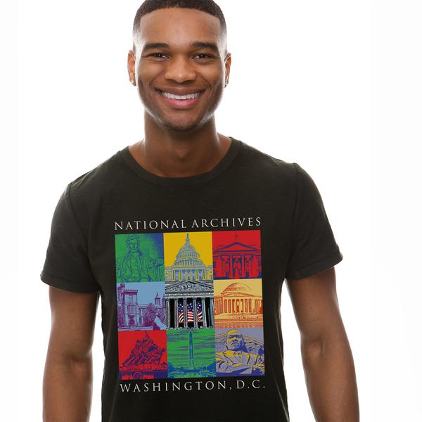 Celebrate our national heritage with color and style and all its stately splendor, with this colorful pop art-inspired t-shirt featuring some of our nation's most famous landmarks. Our Capital Landmarks line of apparel, gifts, and home decor is a National Archives Exclusive.
